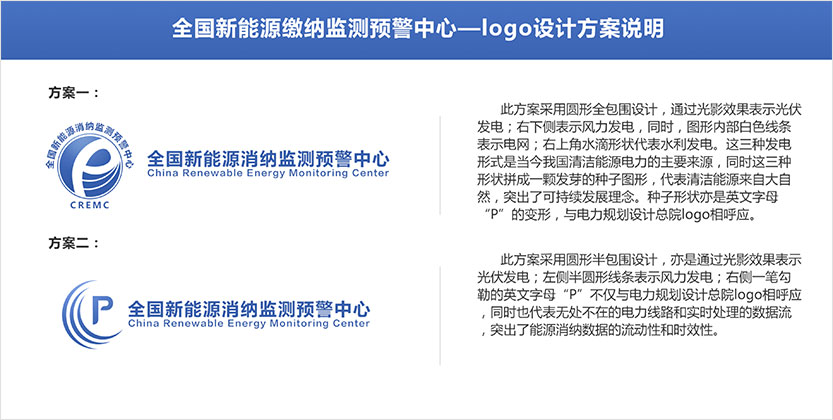 11月5日初次需求調研提出需求: 1.logo要體現中國電力規劃總院元素 2.顏色配比與電力規劃總院保持一致 3.突出風電,光伏發電元素,電網元素和監測動態性 4.樣式設計要簡潔,沉穩大氣,體現專業性