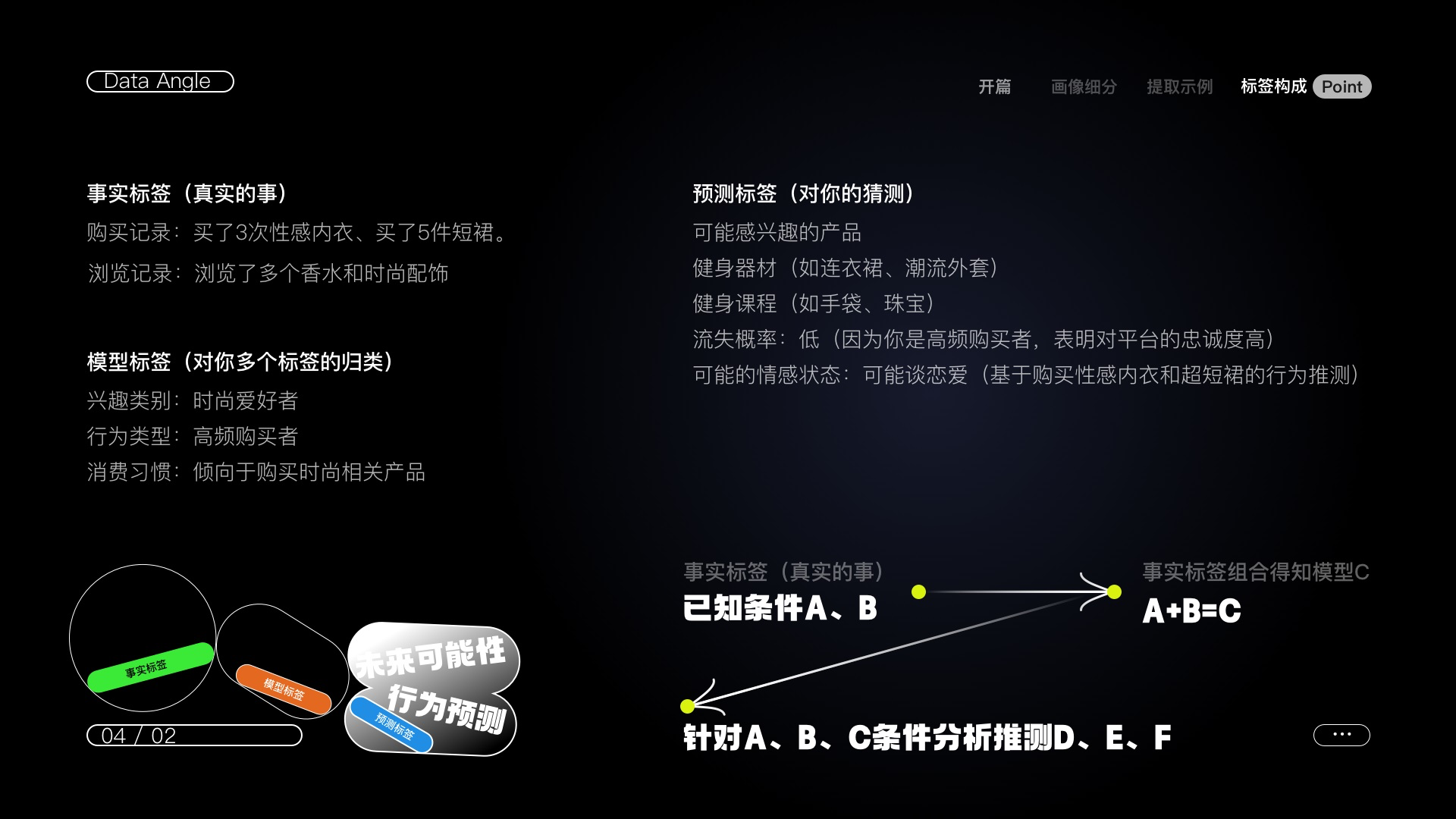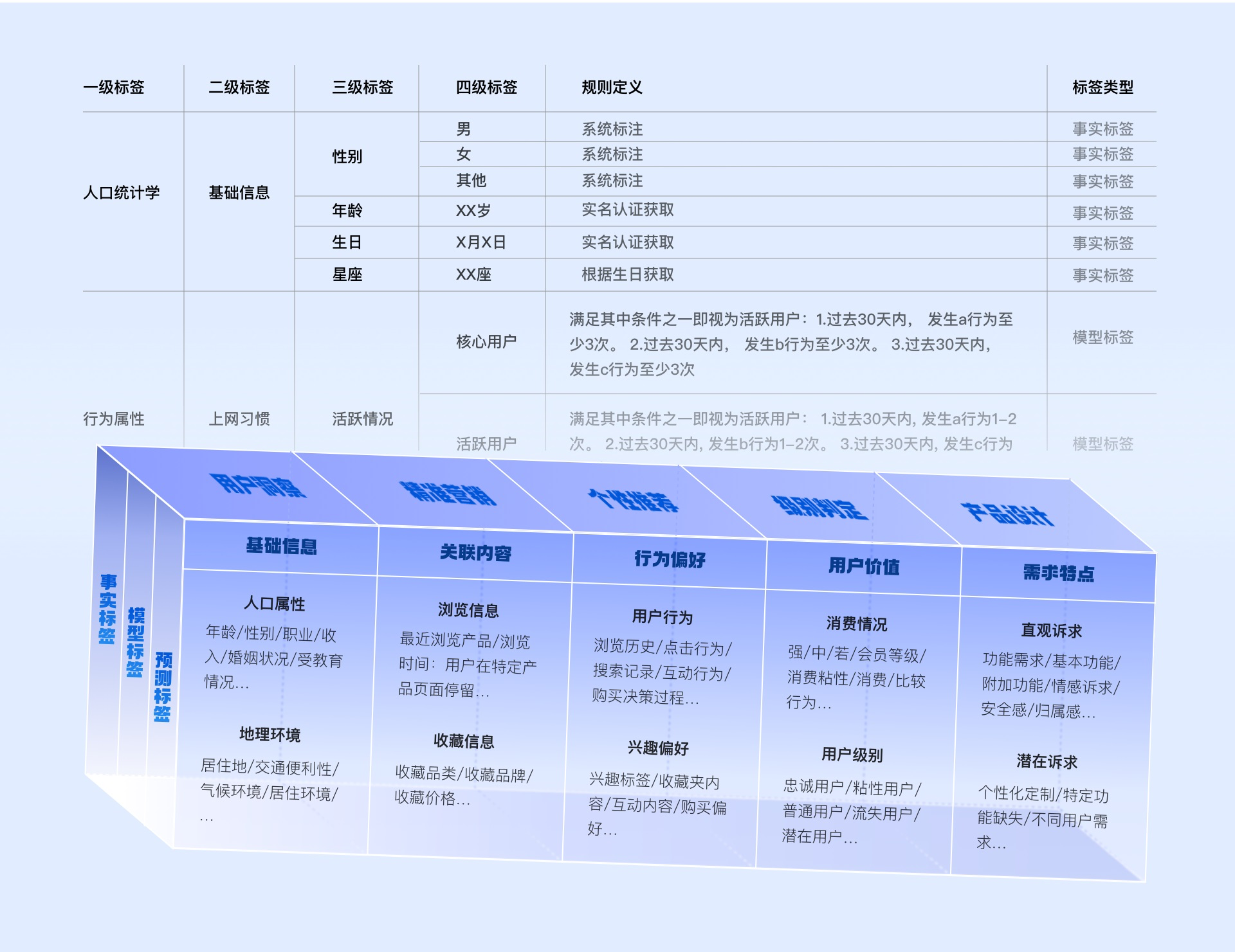 通過分析用戶的行為、興趣和需求,幫助企業精準了解用戶到底是誰,喜歡什么,甚至還可能預測他們下一步會做什么。說白了,就是讓企業從“蒙著眼睛射箭”變成“開著瞄準鏡打靶”。請看下面的圖形化總結,方便大家更直觀理解標簽模型~
