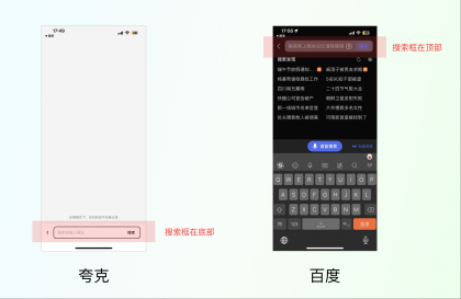 又比如說手機瀏覽器一般都把搜索框放到屏幕頂部,而夸克瀏覽器卻把搜索框放到了下面。