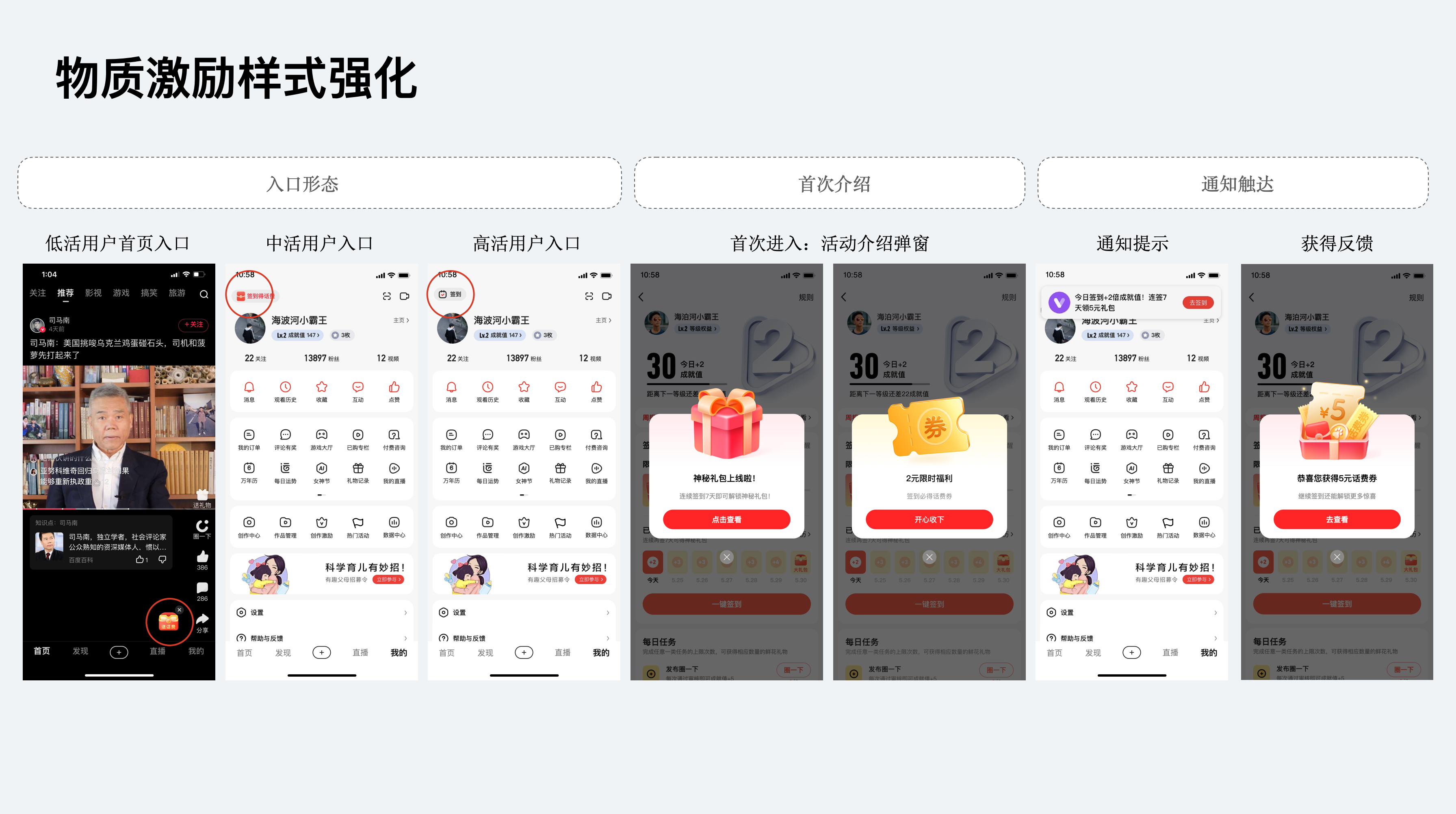 除了精神激勵(lì)外,針對(duì)于低活躍度與中活躍度用戶(hù),進(jìn)行差異化的激勵(lì),用物質(zhì)金錢(qián)刺激用戶(hù)訪問(wèn)或完成任務(wù)。