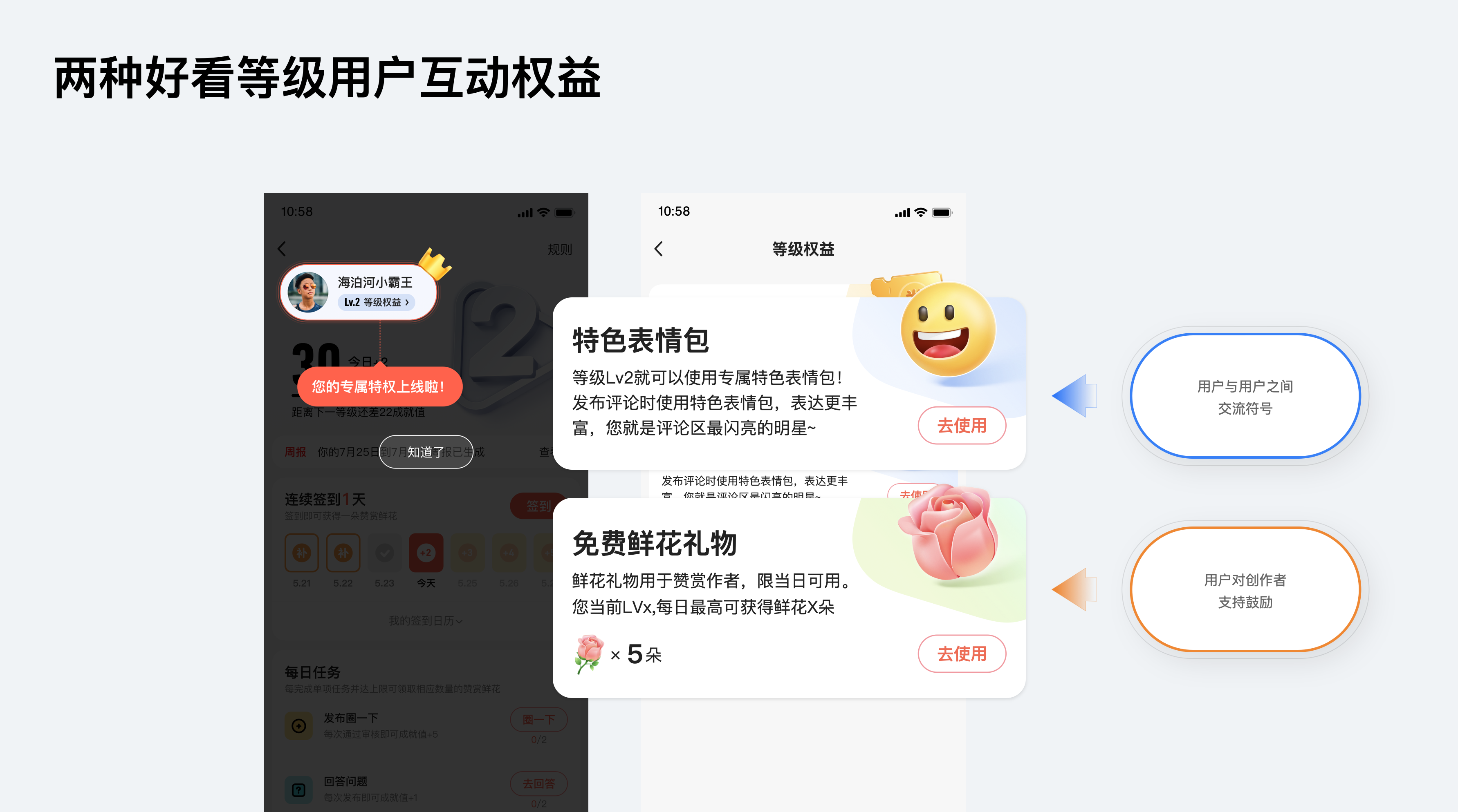 因此在精神激勵(lì)的虛擬權(quán)益上,好看平臺(tái)希望能夠打造一款有記憶點(diǎn)的互動(dòng)方式,一方面;用戶(hù)之間的主要互動(dòng)場(chǎng)景是評(píng)論區(qū),因此權(quán)益之一是打造符合好看人群特征的互動(dòng)表情,創(chuàng)造平臺(tái)特有的互動(dòng)語(yǔ)言來(lái)加強(qiáng)用戶(hù)交流;另一方面好看的內(nèi)容創(chuàng)作者一般為多平臺(tái)創(chuàng)作者,需要讓創(chuàng)作者在好看平臺(tái)上感受到用戶(hù)差異,激發(fā)創(chuàng)作動(dòng)力,因此也塑造了用戶(hù)等級(jí)下的另一個(gè)權(quán)益“鮮花禮物”。作者使用被打賞的鮮花可以進(jìn)行流量曝光的兌換,形成了一個(gè)用戶(hù)側(cè)互動(dòng)激勵(lì)與創(chuàng)作者側(cè)的良性互動(dòng)。
