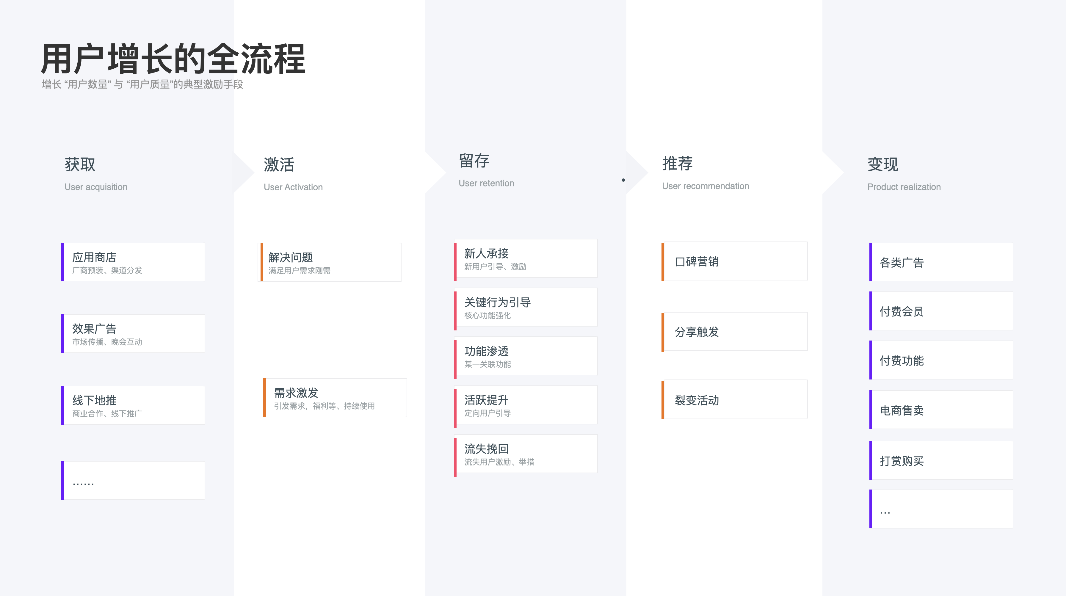 以上是用戶(hù)視角下的激勵(lì)體系,下面講講產(chǎn)品業(yè)務(wù)下的激勵(lì)體系的作用,通常情況下激勵(lì)體系伴隨著用戶(hù)增長(zhǎng)的全流程“獲取—激活—留存—推薦—變現(xiàn)”各個(gè)過(guò)程。用戶(hù)增長(zhǎng)代表著增長(zhǎng)“用戶(hù)數(shù)量”與“用戶(hù)質(zhì)量”,以上三類(lèi)激勵(lì)方式都會(huì)在產(chǎn)品增長(zhǎng)的各流程中承擔(dān)著不同程度的促進(jìn)作用: