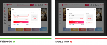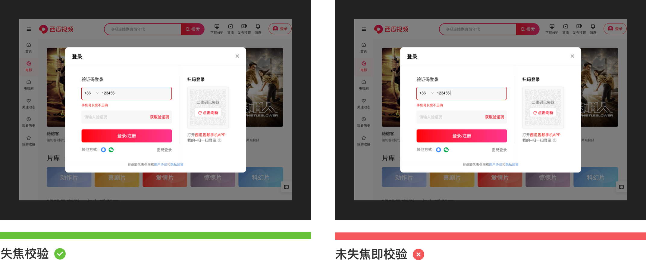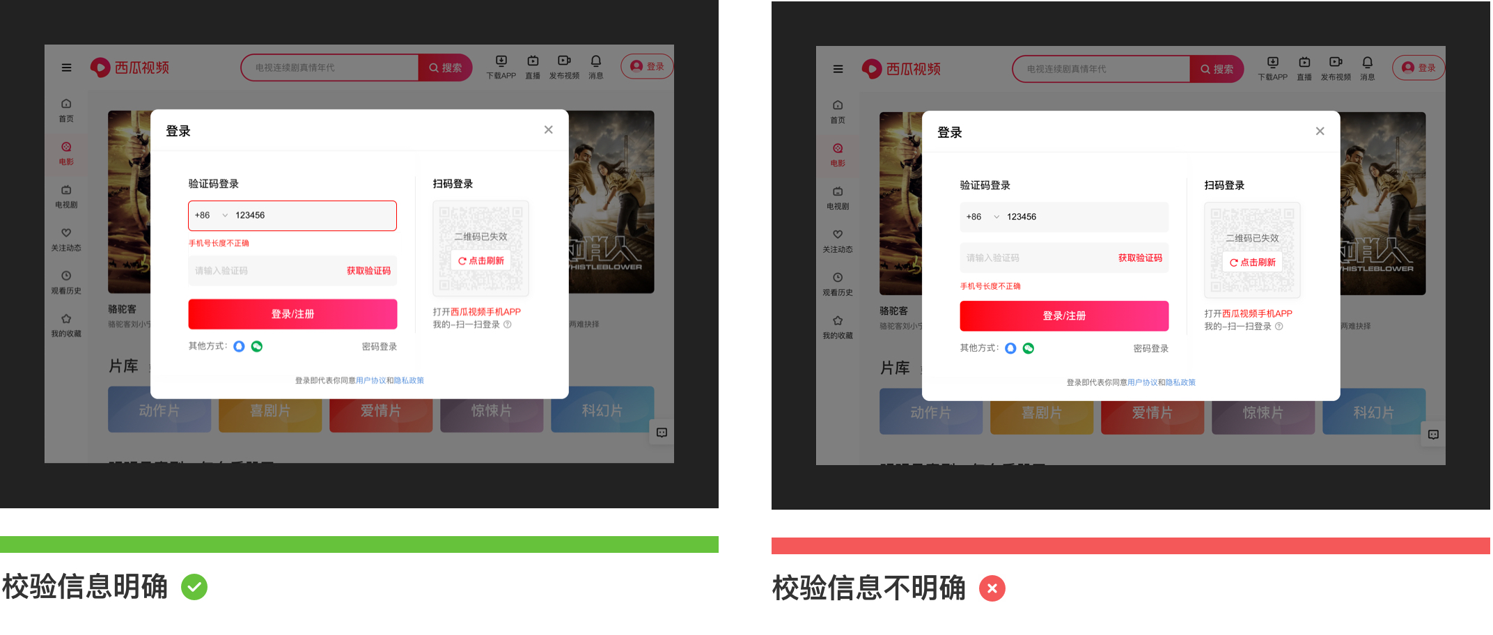 錯誤校驗提示一般存在于錯誤率較高情況下出現,如:在登錄注冊時,要求用戶填寫手機號,如果用戶輸入的手機號碼不符合特定的輸入格式,那么這時候需要明確標記錯誤原因,準確的幫助用戶找到問題并解決,避免錯誤提示描述模糊不清誤導用戶。錯誤提示一般會采用“雙重視覺強調”來顯示錯誤,除了輸入框突出顯示外,同時需要在輸入框下方加入紅色指導文字。如下圖所示為西瓜視頻登錄注冊場景下的截圖: