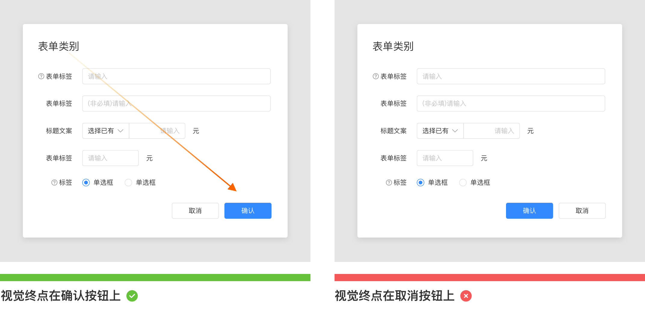 如下圖是一個彈窗類型的表單,如果根據業務訴求確認操作重要程度強于取消操作,那么確認按鈕應該放在取消按鈕的右邊。因為確認按鈕放在右側(終點區) 用戶關注度會更強。