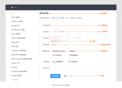 表單組件:包含了輸入框、下拉框、日期選擇器、時間選擇器、開關、上傳等十幾種類型,是形成表單的核心內容;