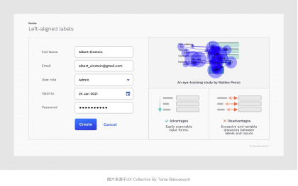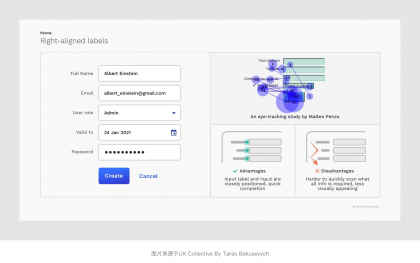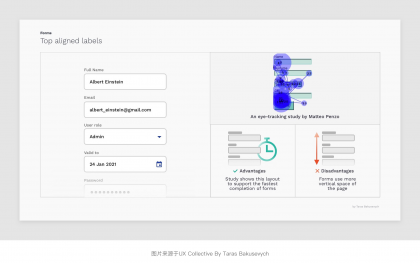 將表單標簽放置在其對應輸入字段的正上方,并垂直左對齊排列,用戶只需依次向下瀏覽即可看到標簽與輸入字段兩個元素。其優勢是橫向屏幕空間足夠,能夠比較友好的適配多語言適合非中國區業務表單使用。并且根據上面Matteo Penzo的時間表上看,頂部對齊的瀏覽和填寫的效率也是3種常規的對齊方式中較高的一種。不足點是會占用較多的縱向垂直屏幕空間,此外應當注意每組表單標簽和輸入字段與其他字段組的間距,以免層級區分度不夠的問題。