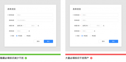 當表單中的必填信息多于非必填信息時,如果使用紅色星號表示必填項,那么大量紅色星號導致增加用戶的認知負擔,使得用戶無法快速識別哪些是必須填寫的,哪些是不必須填寫。并且使用紅色星號會帶給用戶一些恐懼感,它增加了出錯的風險并降低了表單填寫率。因此在表單設計中,當必填項多于非必填項時,隱藏紅色星號標記,通過暗提示標記可選項的形式來幫助用戶識別。