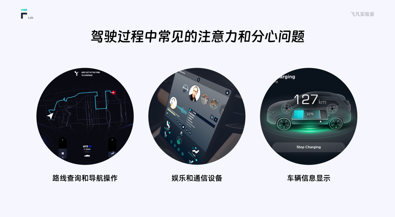 在駕駛過程中,有一些常見的注意力和分心問題需要我們關注和解決。路線查詢和導航操作:駕駛員需要查看導航系統、調整路線和尋找目的地等操作,這可能轉移駕駛員的注意力,導致駕駛員對道路情況的關注度下降。娛樂和通信設備:駕駛員使用娛樂系統或通信設備進行音樂播放、電話通話或信息發送等操作,這會分散駕駛員的注意力,增加駕駛風險。車輛信息顯示:車輛上的信息顯示系統可能包含大量的信息,如車速、油耗、車輛故障等,駕駛員需要分散注意力去獲取和理解這些信息,這可能影響駕駛員對道路情況的感知和對緊急情況的反應能力。了解駕駛員的注意力和分心因素對于優化車載界面設計至關重要。那么我們如何幫助駕駛員保持集中注意力,并減少分心情況的發生。