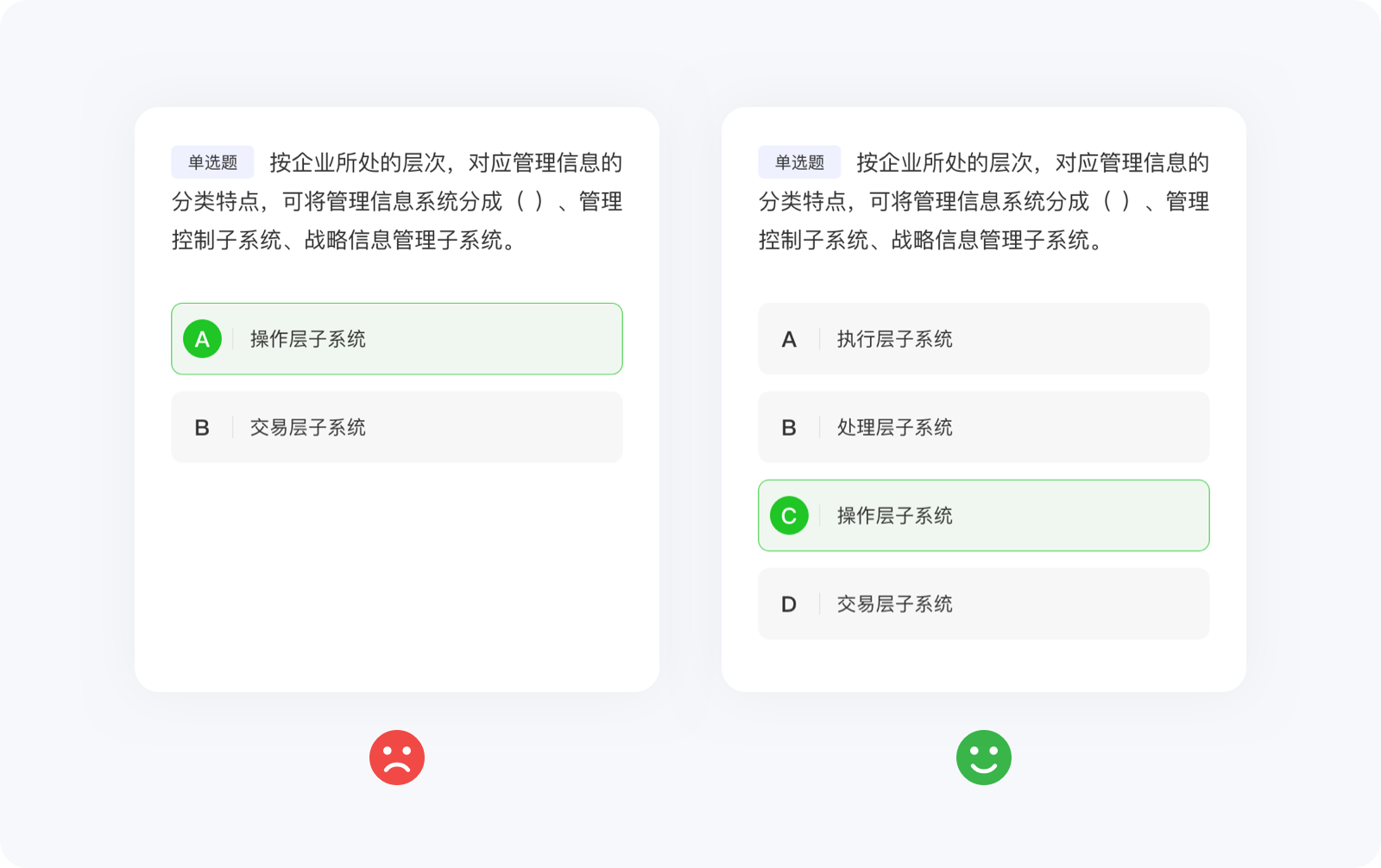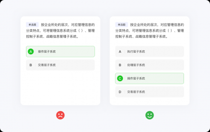 任何定律都有其自身的使用局限,所以也不要極度推崇希克定律而簡化到抽象的地步。大部分情況下,希克定律都是用在可交互界面中的元素,對于那些需要高度搜索、閱讀或?qū)W習(xí)刷題類的功能并不適用,因為設(shè)計師只能決定信息呈現(xiàn)的視覺效果,并不能決定內(nèi)容的質(zhì)量、類型與數(shù)量。例如,刷題類應(yīng)用,面對海量的選擇題,希克定律雖然失去價值,但并不影響設(shè)計師結(jié)合其他方法論將界面設(shè)計的更好,總不能強(qiáng)行使用希克定律,將選擇題刪減到只剩兩個(變成判斷題)選項吧。