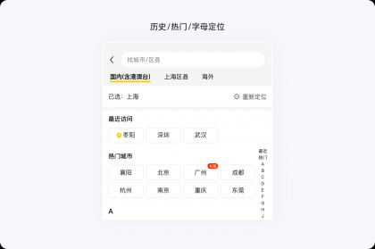 另外,我們在選擇地址時,如果將所有城市一股腦平鋪在界面上,用戶想要選擇自身所需,則需要花費(fèi)大量的時間。對城市進(jìn)行了分類分層,以及有了搜索歷史、熱門城市以及右側(cè)的首字母索引后,用戶就能通過不同維度快速找到想找的城市,選擇效率直線上升。