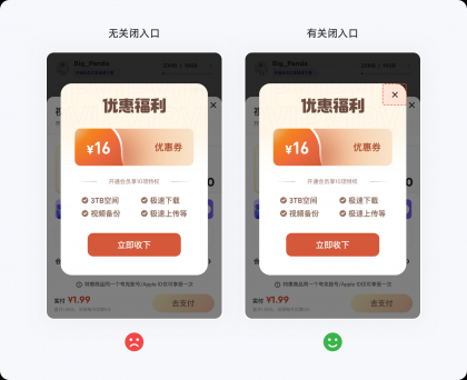 希克定律要做的是通過減少用戶做決定的時間,來提升轉(zhuǎn)化率以及用戶體驗,但不管在什么情況下,用戶都希望自己還擁有選擇的權(quán)利,如果設(shè)計師自作聰明的將選項減到只剩一個,就相當(dāng)于告知用戶必須接受,那么用戶就有種被強(qiáng)制、綁架的感覺,只會存在兩個結(jié)果:①被你的產(chǎn)品拿捏、②離開你的產(chǎn)品,筆者相信第一種可能性的概率極低,畢竟同類型的產(chǎn)品并不是只有你一家(壟斷除外)。如下圖的彈窗,用戶即便不愿意進(jìn)入任務(wù)流程,可別無選擇,只能進(jìn)入后再返回才能回到原位,這種做法無端增加用戶的操作成本,極易引起反感情緒。不管產(chǎn)品如何希望用戶轉(zhuǎn)化,切不可強(qiáng)制他們接受,需要給用戶留一條返回的“路”,即便不那么起眼,至少還有選擇的權(quán)利。