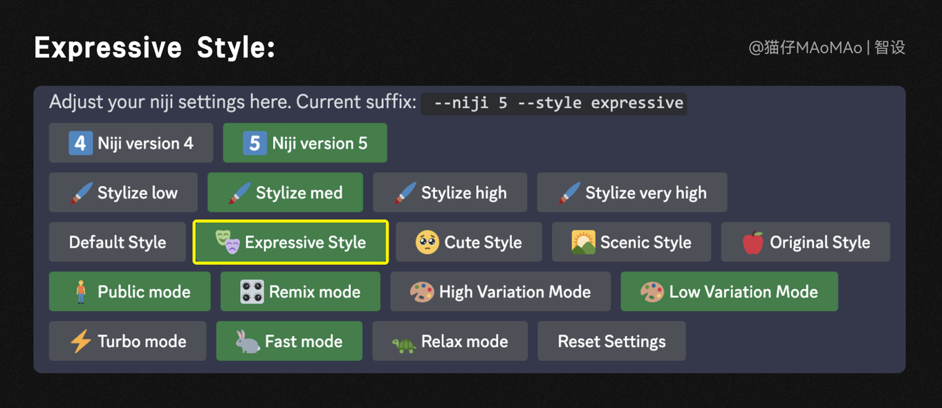 因為是單個元素生成,背景環境關鍵詞可以省略,大家在編寫關鍵詞時,注意靈活增減,不用一定按照所謂的公式來寫,藝術風格是插畫素材,我們直接使用niji模型,其中expressive風格會讓插畫更加富有表現力,可以直接在關鍵詞后面加上后綴“--style expressive ”,或者用“/settings”命令,更改設置。
