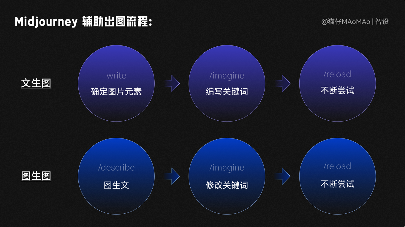 文生圖:顧名思義,需要自己腦暴出關鍵詞出圖,再通過修改關鍵詞,不斷踐行嘗試出圖。圖生圖:在有參考圖的情況下,用 /describe 圖生文命令,讓系統直接生成關鍵詞,再通過修改關鍵詞,不斷進行嘗試;我們先使用這種方式生成背景素材。