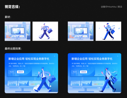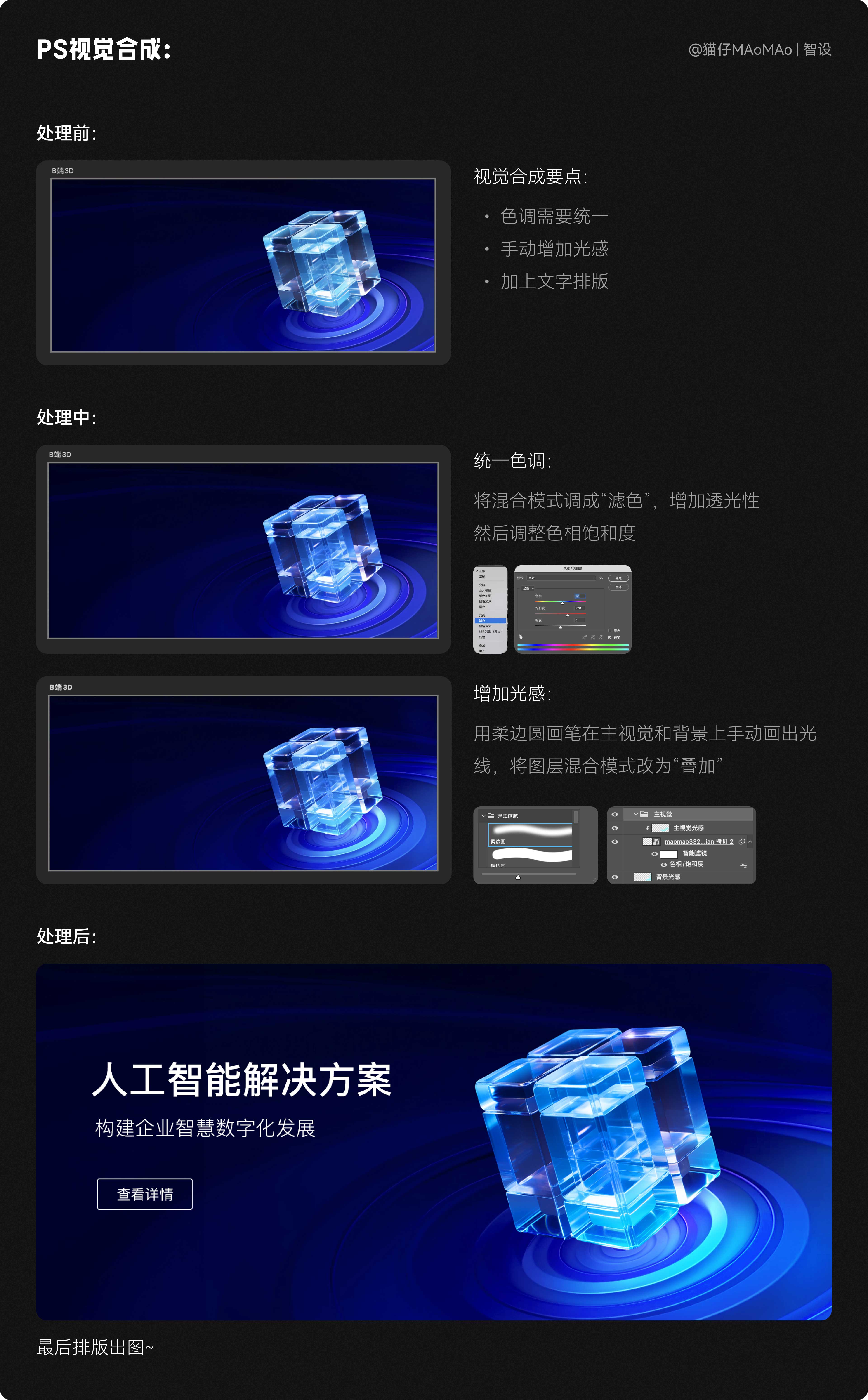 這一步考驗的是設計師的審美和手活,我們需要把背景和主視覺素材,進行視覺合成,其實也非常簡單:這里我定的主要色調是藍色+青色的光感,首先需要將色調整體統一;然后想要表現出玻璃質感的通透,我們需要加上一些光感;最后文字排版出圖即可~
