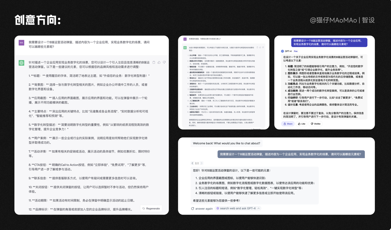 在沒有設計方向的時候,不妨讓AI大語言模型來幫助我們,它會根據需求的業務場景,給出合理的內容建議,以及畫面元素的建議。
