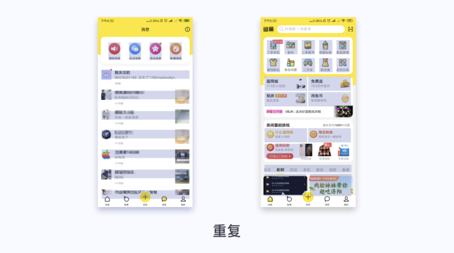 閑魚消息頁面,頭部功能區域圓形圖標重復,字體重復。消息列表頭像、名稱、消息、圖片重復,保持一致性,和統一。