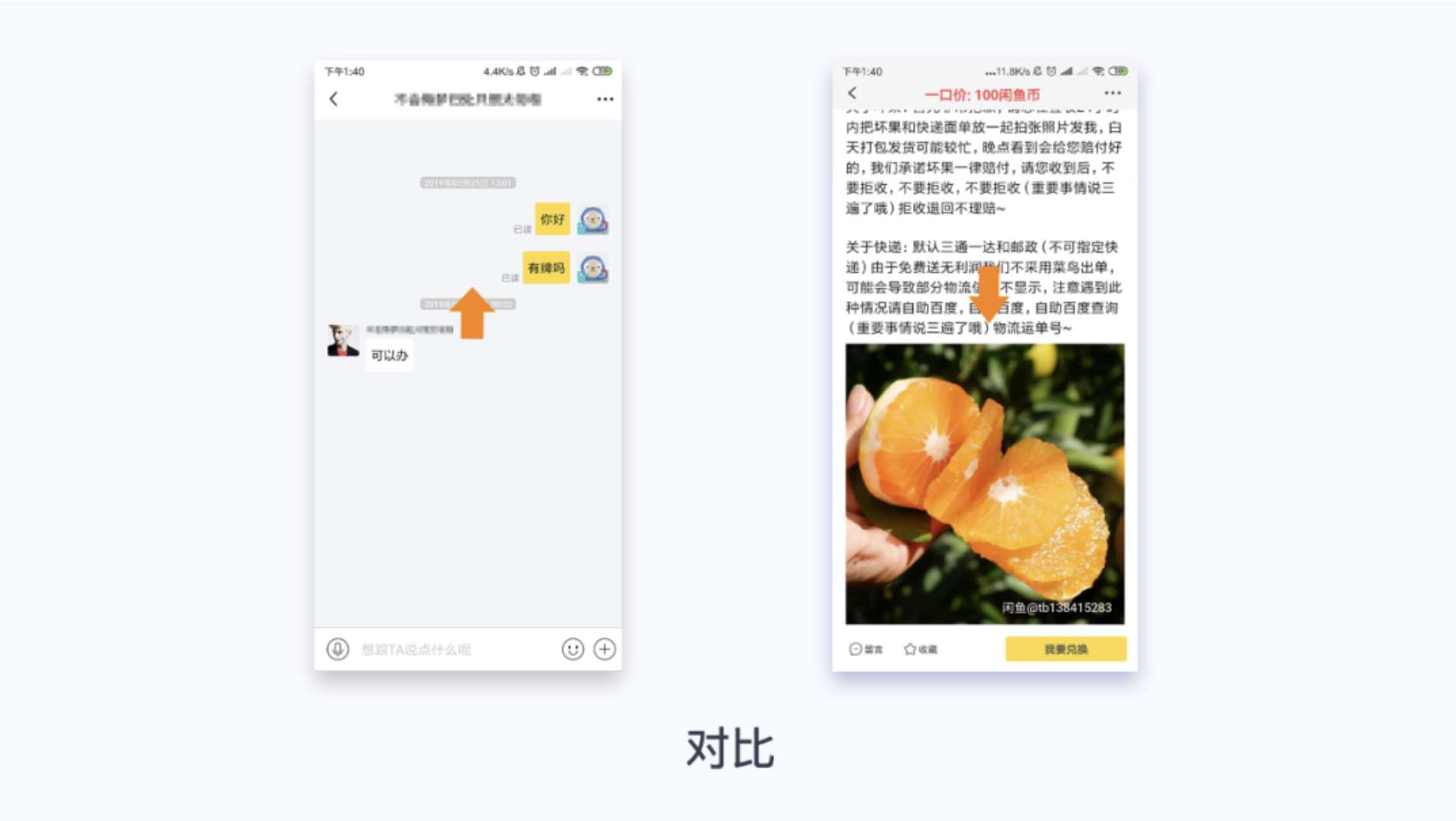 閑魚聊天頁面,雙方消息顏色對比,色彩的對比更加強的雙方聊天的視覺效果,對比也是比較明顯。