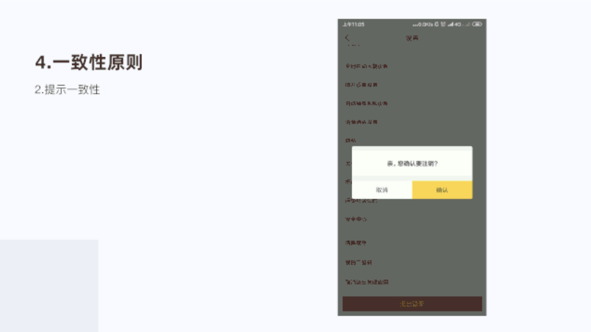 在退出登錄提示是否要注銷登錄,把確認層級加大,放在右邊,清晰提示用戶,防止用戶出錯