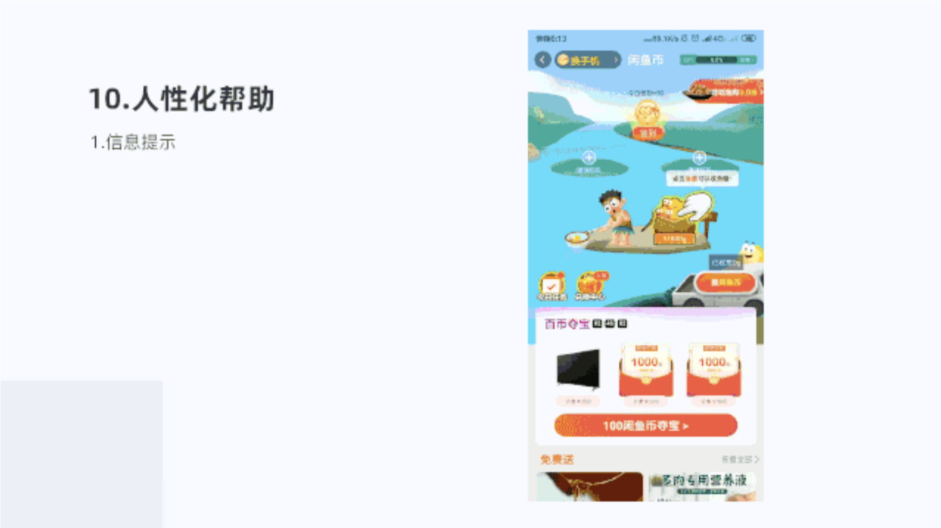 目標引導設計,劃定規則和目標路徑,引導用戶參與其中,在簽到活動頁面一個小路徑,用戶點擊撈魚,撈上來之后,就可以兌換閑魚幣了,讓用戶趣味游戲同時獲得閑魚幣,提升參與感,增強了用戶體驗。