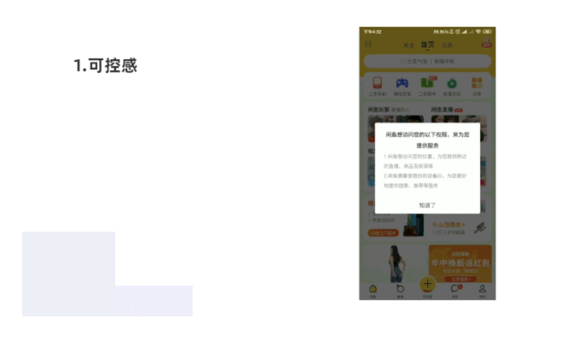 閑魚用戶登錄之后需要獲取權限,告知用戶選擇是否授權于產品這些權限,讓用戶操作可控。