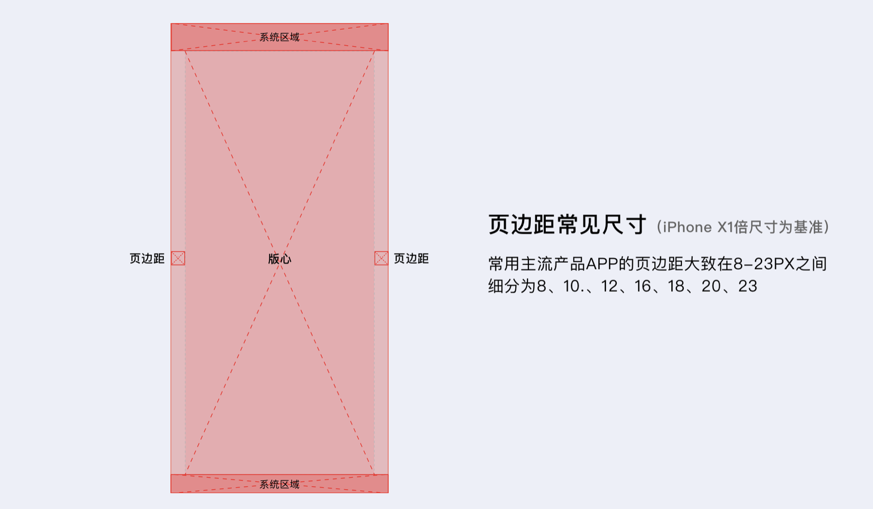 2. 版心邊距:常用尺寸 8-23PX(以 iPhone X1 倍尺寸為基準),內容多的文字類和購物類產品邊距較小,圖片、視頻類產品邊距較大。