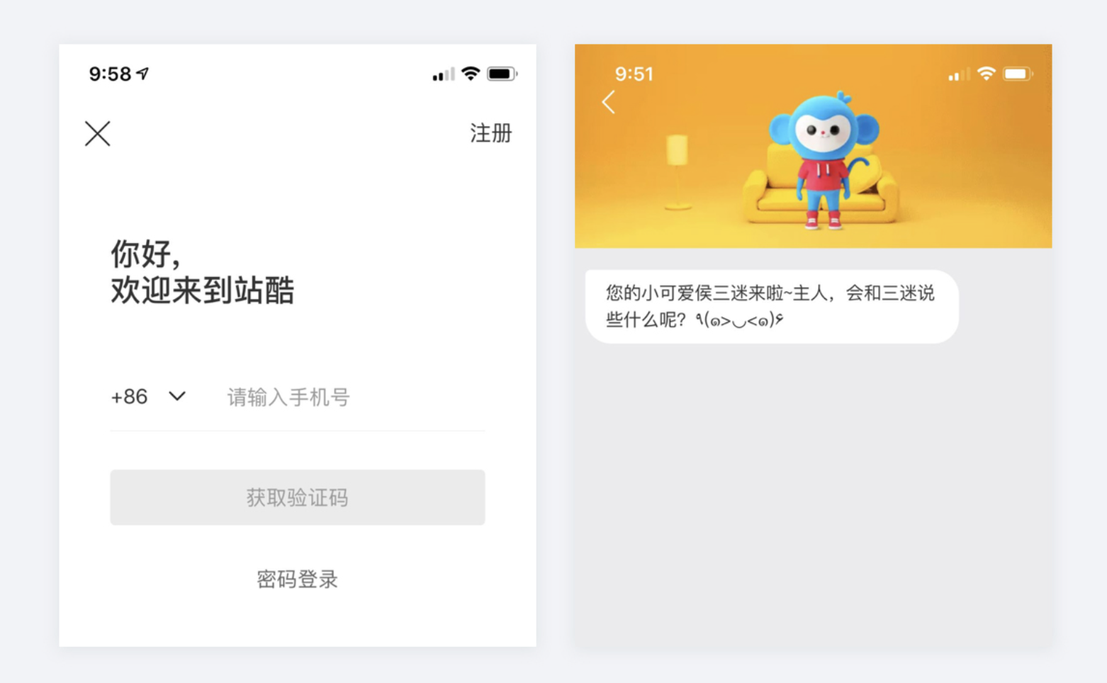 • 有趣的擬人化動作設(shè)計:產(chǎn)品作出擬人化互動反饋,讓用戶感到有趣,如嗶哩嗶哩 APP 登錄輸入密碼時,IP 形象 22 和 33 會把眼睛捂起來,給用戶安全感且有趣。