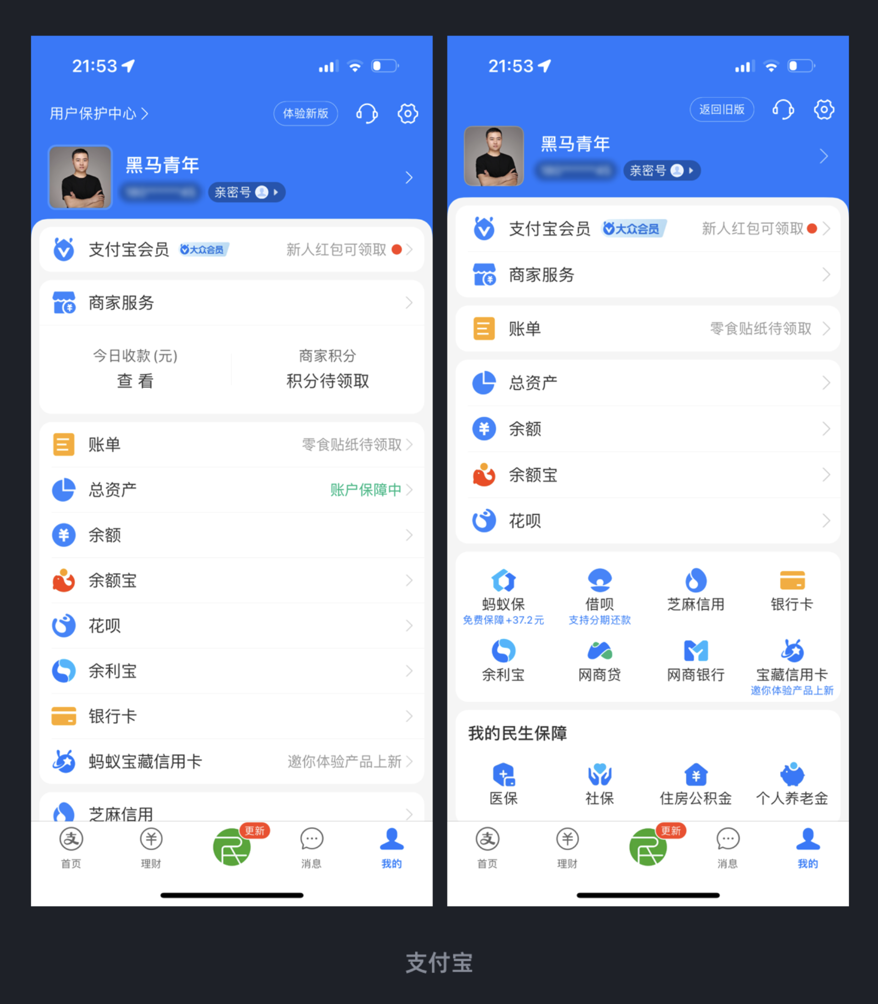 支付寶新版個人中心優化布局,將原列表布局改為列表與宮格結合的形式,使更多功能在首屏曝光,既提高了版面利用率,也讓用戶操作更快捷。