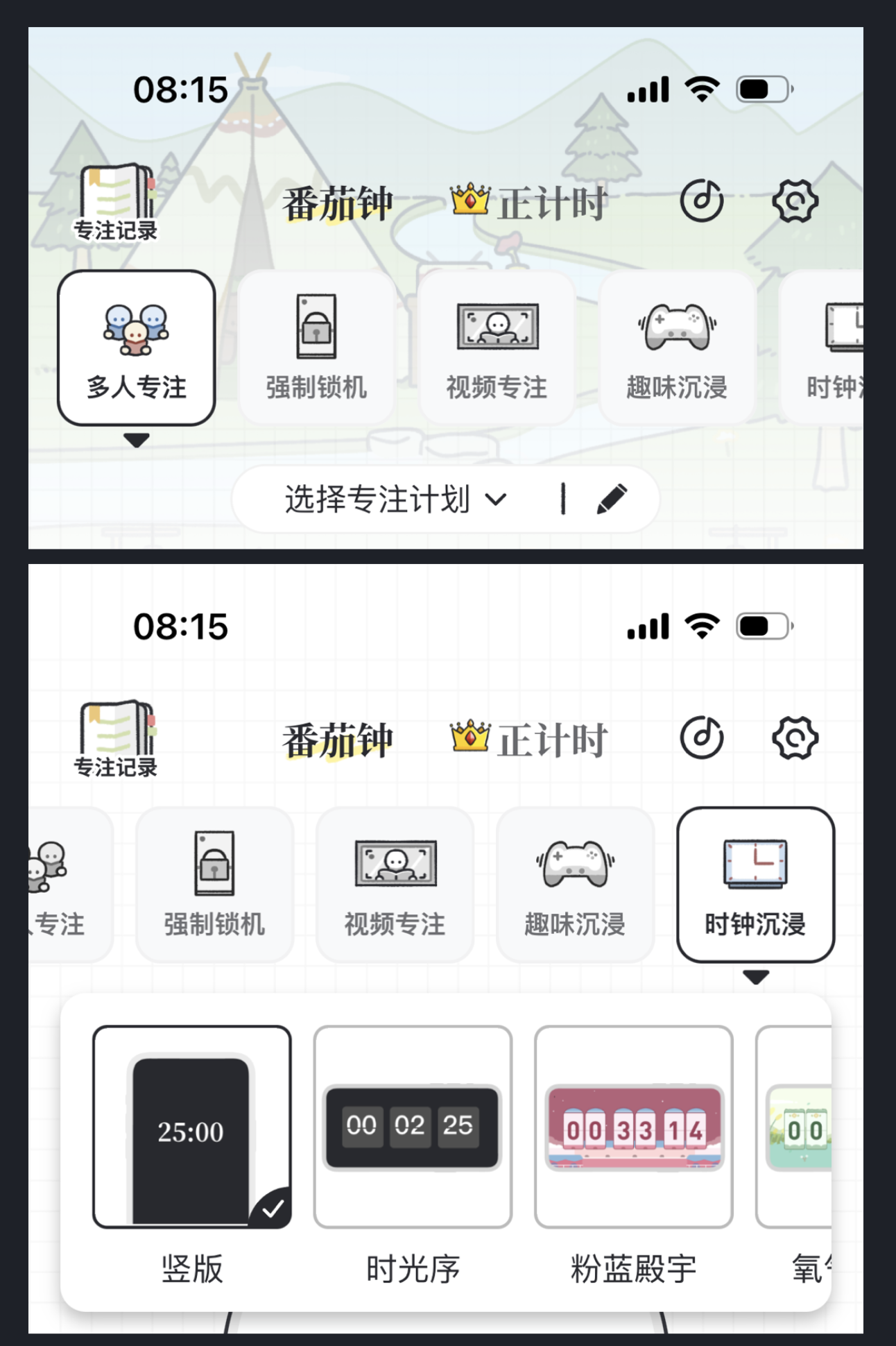 “我要做計劃” App 的 “專注” 欄目采用懸浮式主題篩選,用戶可選擇登山、海底探險等主題,直觀的樣式讓設置操作更清晰,提升了感官和體驗感。