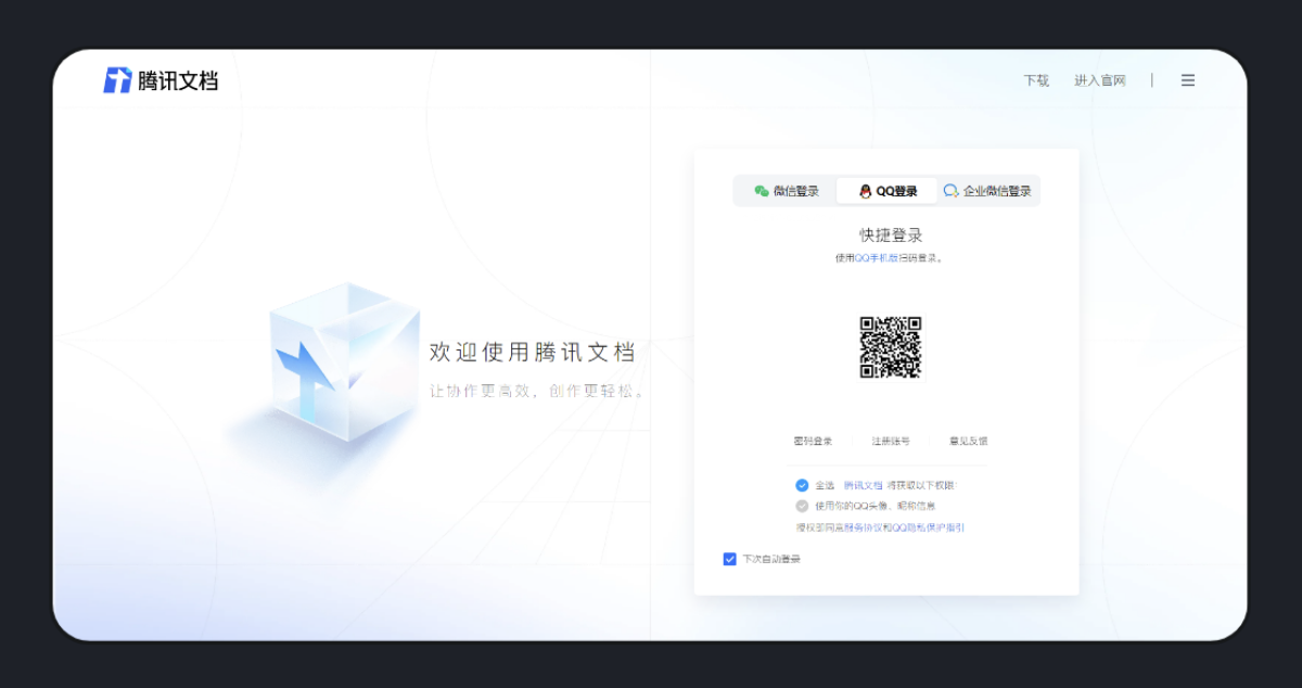 在符合業務邏輯的基礎上,體驗設計能優化 B 端產品復雜的流程,將復雜的迷宮簡化成一條直線,讓用戶操作界面時感到暢通舒適。騰訊文檔的登錄頁沒有讓用戶輸入一連串的賬號和密碼,而是采用二維碼方式,用戶掃碼即可登錄,快捷又方便,大大簡化了登錄流程。