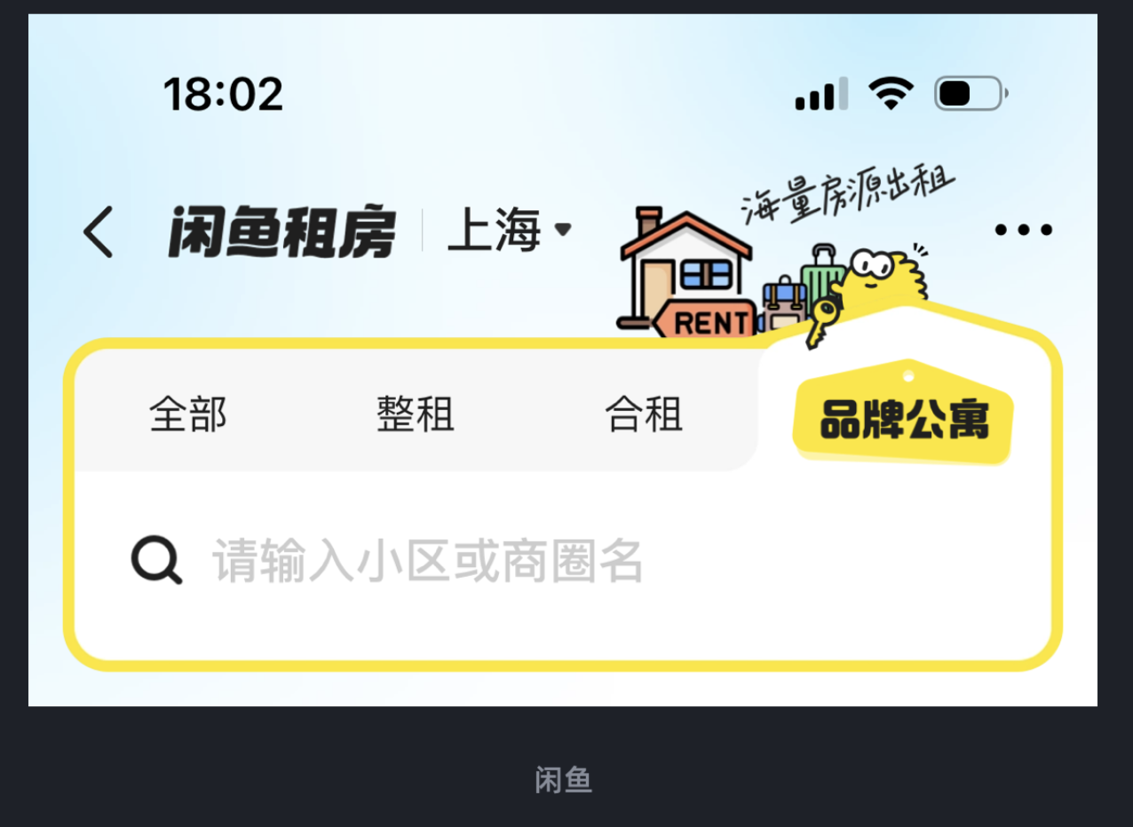 傳統(tǒng)租房板塊多以 “文字 + 普通卡片” 呈現(xiàn),用戶需先讀文字才能識別功能;閑魚則直接將 “房屋結(jié)構(gòu)” 轉(zhuǎn)化為視覺符號 —— 卡片上用簡化的房屋輪廓圖標(biāo)替代傳統(tǒng)標(biāo)簽,配合 “RENT” 英文標(biāo)識,讓用戶一眼就能關(guān)聯(lián) “租房” 業(yè)務(wù)。這種設(shè)計不僅強化了業(yè)務(wù)屬性,還通過圖形化降低了信息識別成本,同時獨特的視覺符號也加深了用戶對產(chǎn)品的記憶度。