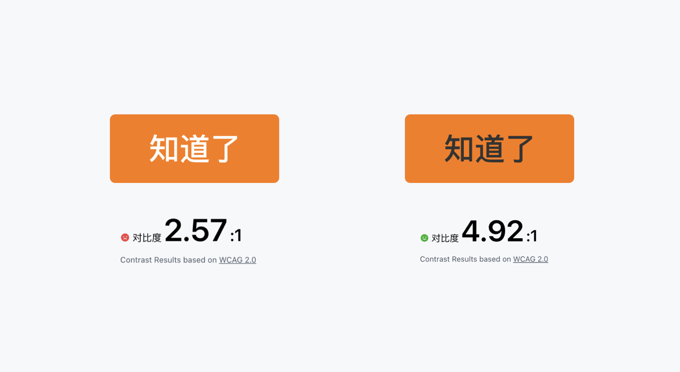 不少設(shè)計師將 WCAG 對比度數(shù)值奉為圭臬,認為未達標的設(shè)計就是不合格的。但實際場景中,算法計算與用戶真實感知往往存在偏差。例如兩個橙色背景的按鈕,黑色文本對比度 4.92:1(符合標準),白色文本僅 2.57:1(未達標準),可多數(shù)用戶(包括色盲群體)卻反饋白色文本更易閱讀。這是因為淺色背景與白色文本的視覺融合度更高,亮度感知的舒適度并非單一對比度數(shù)值能定義。
