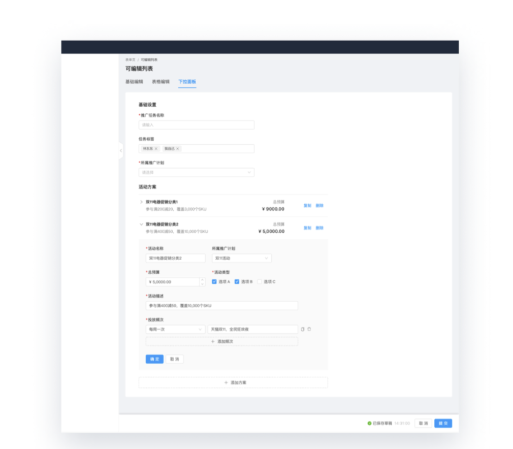 • 按類別劃分折疊面板(如 “基礎設置”“活動方案”“排期規則”),默認展開核心模塊,次要模塊可折疊;