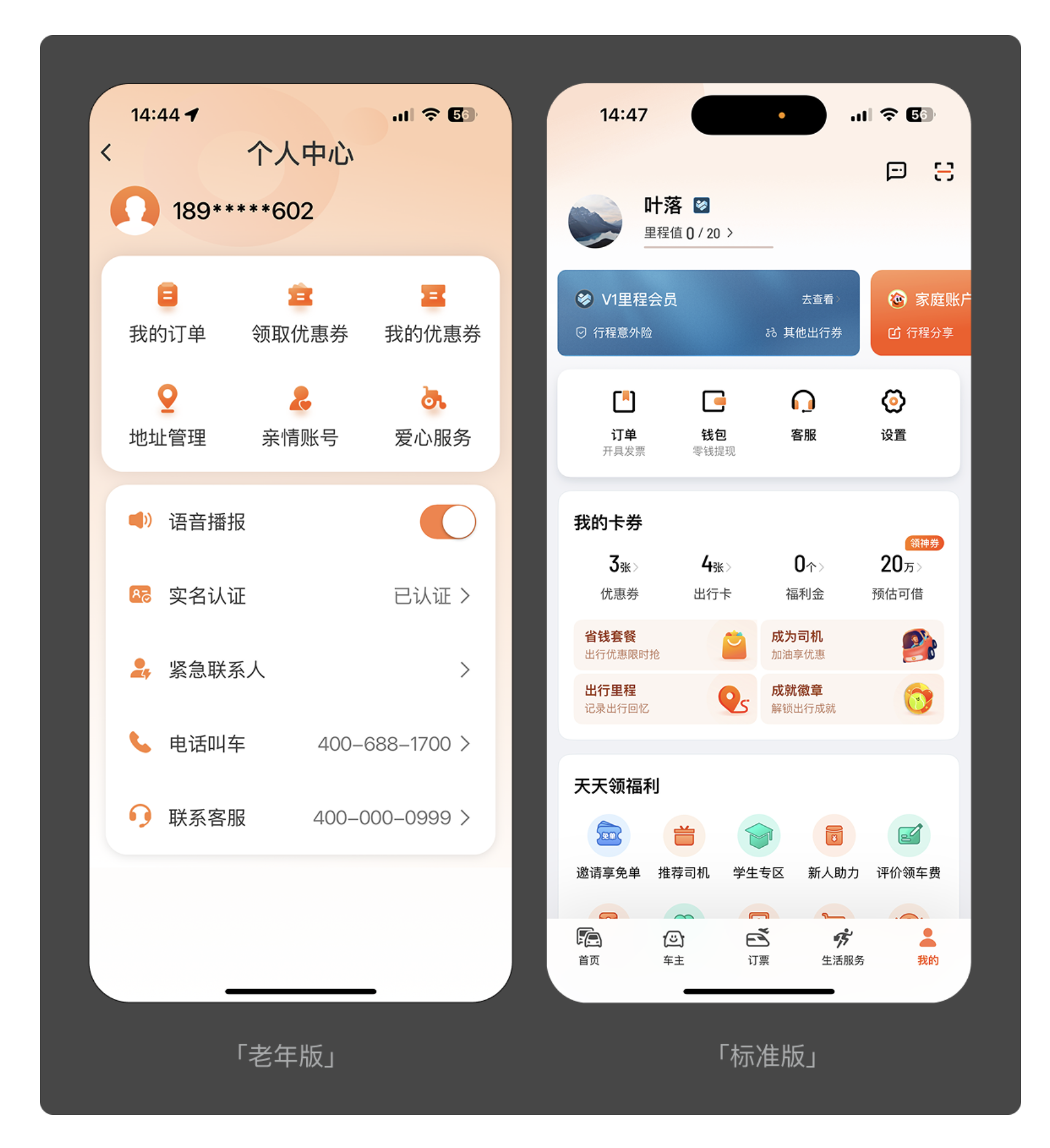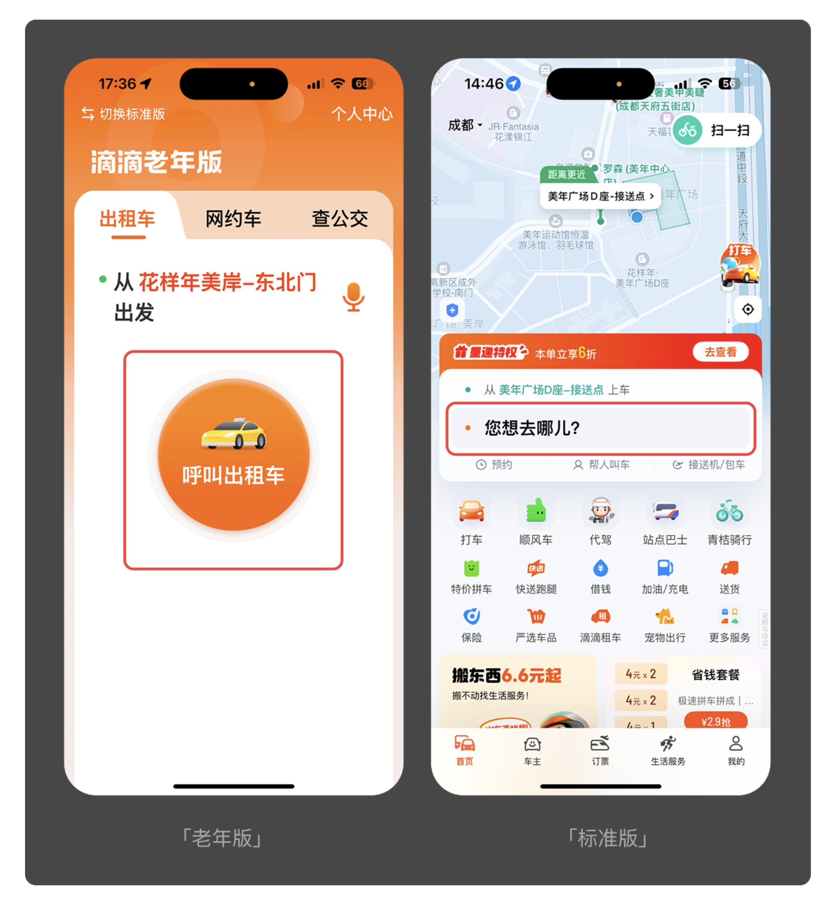 清晰的界面是老人順利操作的基礎。老年用戶的視覺敏感度下降,過小的字體、密集的圖標、復雜的排版都會給他們帶來困擾。滴滴老年版將主要功能模塊以大字體、高對比度的圖標形式呈現,摒棄了標準版中繁雜的附加服務入口,讓 “打車” 這一核心功能一目了然;淘寶老年版則聚焦老人常用的 “購物、訂單、客服” 功能,隱藏了百億補貼、直播帶貨等復雜板塊,用簡潔的布局和醒目的文字,降低了視覺識別成本。好的適老化界面設計,就像給產品 “畫重點”,讓老人無需費力尋找,就能快速定位所需功能。