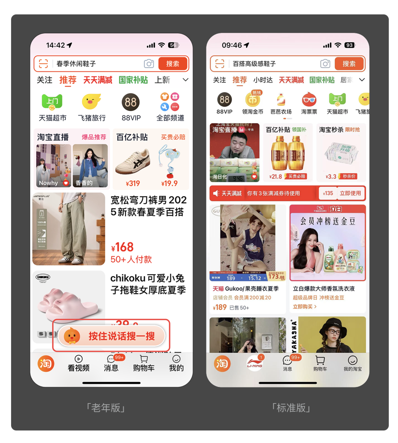 打字對于許多老人而言是一大難題 —— 視力模糊導致按鍵不準、拼音基礎薄弱難以拼寫,這些都讓文字輸入成為數字使用的 “攔路虎”。語音操作的引入,恰好解決了這一痛點。淘寶老年版在底部導航欄設置了顯眼的 “按住說話搜一搜” 按鈕,老人只需說出商品名稱,即可完成搜索,無需手動輸入;中國工商銀行老年版也加入了 “語音操作” 功能,查詢賬戶余額、辦理生活繳費、購買理財產品等操作,都能通過語音指令完成,極大簡化了操作流程。語音交互以更自然的方式搭建起老人與產品的溝通橋梁,讓操作門檻大幅降低。