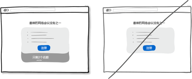 物以稀為貴。饑餓營銷給出的信息就是東西不多,只剩幾件,明天再來,可能沒了。你去比較一下批發與限量版的東西他們的價格差距有多大就知道了。回過頭來看,那些批發商或者大零售商,他們也使用饑餓營銷,以獲得更好的銷量。但在軟件行業,我們經常會忘記有饑餓營銷這回事。因為數字產品是可以很容易拷貝復制的,不存在缺貨的情況。其實,在界面設計中,也可以將其運用起來與現實中的資源緊缺進行聯系。想想一次網上研討會的門票,想想你一個月可以服務的人數限制,這些信息都可以告知用戶是有限的。