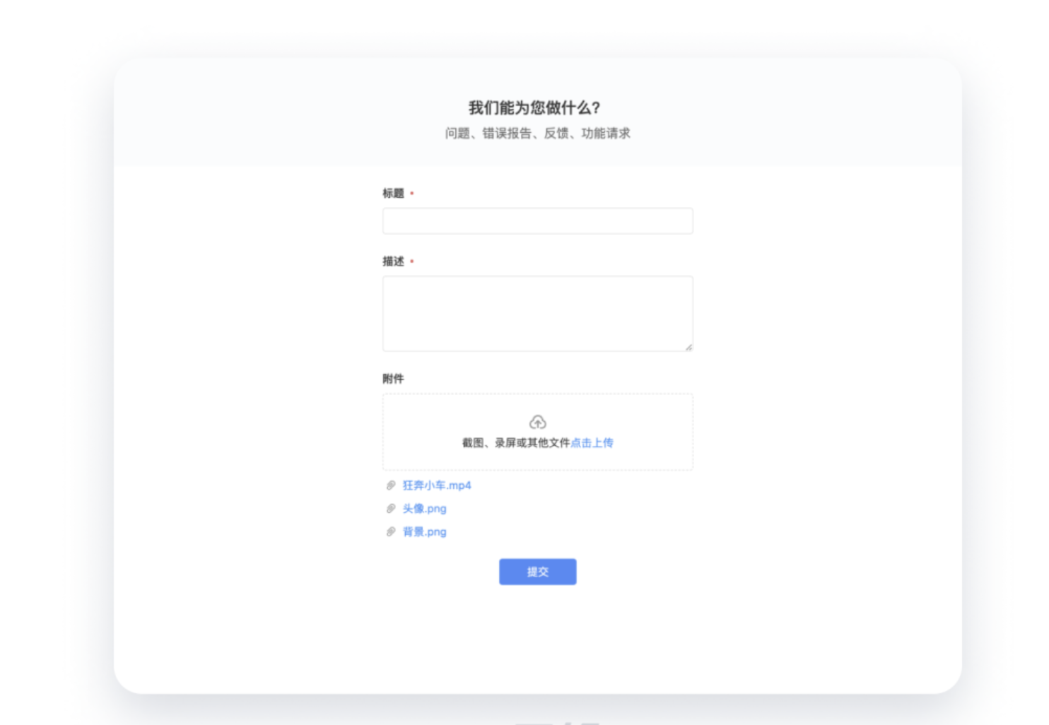 示例場景:簡單的錯誤報告表單,僅包含 "問題標題"" 描述 ""附件" 三個字段,采用單列布局讓用戶快速完成提交。