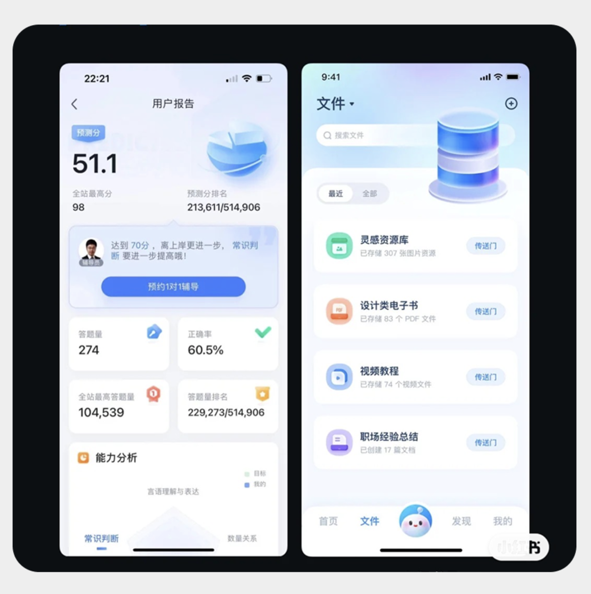 例如設(shè)計(jì)資源庫的 “電子書合集”“視頻教程” 卡片,學(xué)習(xí)平臺(tái)的 “能力分析”“答題報(bào)告” 卡片,會(huì)標(biāo)注文件數(shù)量、答題正確率、排名等信息,讓用戶快速獲取核心分類線索。