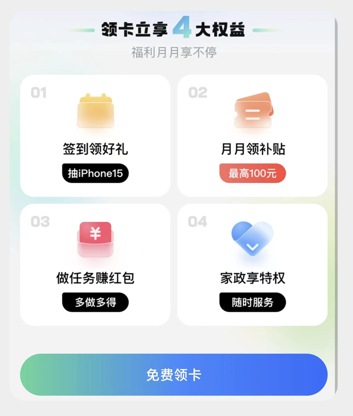 比如會(huì)員權(quán)益卡片、產(chǎn)品功能介紹卡、活動(dòng)福利卡,常通過分點(diǎn)列舉的方式展示 “簽到領(lǐng)禮”“專屬補(bǔ)貼”“會(huì)員特權(quán)” 等內(nèi)容,搭配醒目的引導(dǎo)按鈕,強(qiáng)化價(jià)值傳遞。