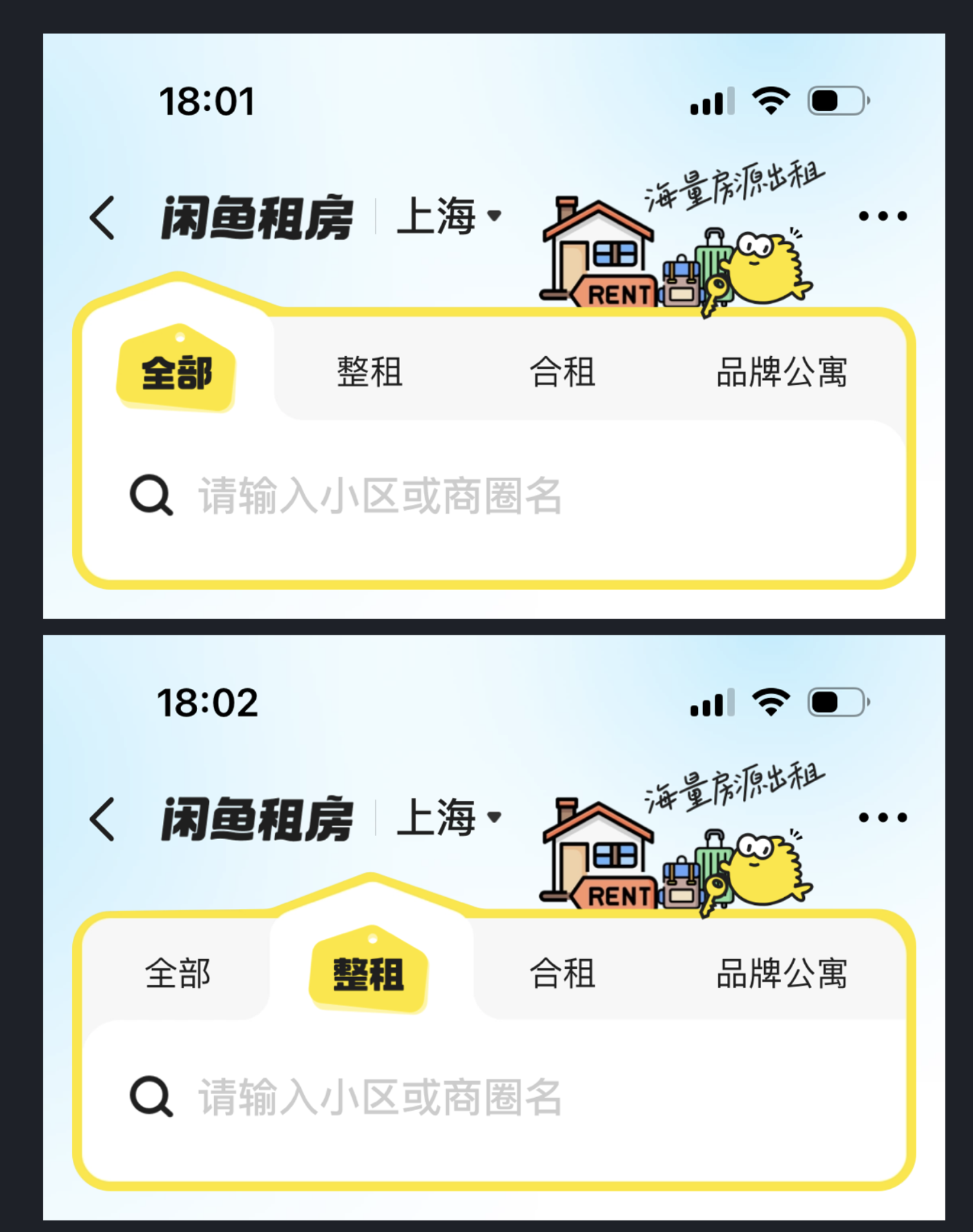 閑魚(yú)租房欄目的卡片設(shè)計(jì)便是典型,它摒棄了常規(guī)的矩形卡片框架,將房屋結(jié)構(gòu)的輪廓融入卡片造型,用極簡(jiǎn)的幾何圖形還原戶型特征,既貼合租房的業(yè)務(wù)核心,又讓卡片設(shè)計(jì)跳出了同質(zhì)化的視覺(jué)桎梏。這種將業(yè)務(wù)特征與視覺(jué)設(shè)計(jì)結(jié)合的方式,不僅讓卡片更有辨識(shí)度,還能讓用戶一眼感知到功能屬性,實(shí)現(xiàn)了美觀與實(shí)用的雙重效果。