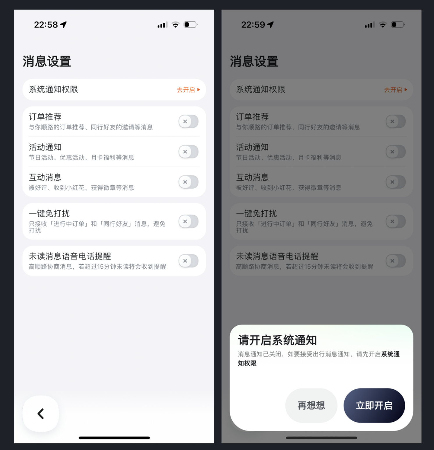 嘀嗒出行的消息設(shè)置設(shè)計(jì)就極具人性化,它沒(méi)有刻意弱化關(guān)閉按鈕,反而讓操作更直觀;同時(shí)為了避免消息過(guò)度干擾,特意設(shè)計(jì)了 “一鍵免打擾” 功能,讓用戶可自主選擇僅接收核心消息。這種設(shè)計(jì)摒棄了 “單向引導(dǎo)” 的思維,而是賦予用戶選擇權(quán),既實(shí)現(xiàn)了引導(dǎo)開(kāi)啟通知的核心目的,又兼顧了用戶的使用體驗(yàn),讓交互設(shè)計(jì)更有溫度。