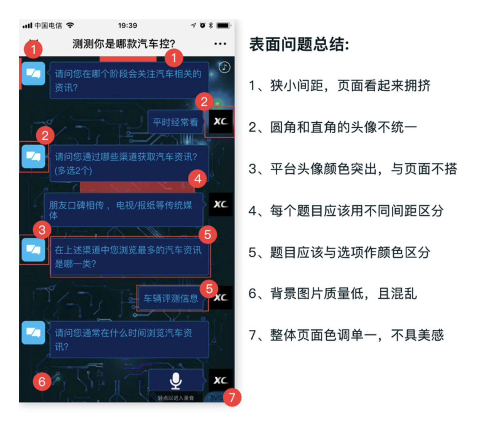 本次案例為一款以人機(jī)對(duì)話 UI(Conversation UI,簡稱 CUI) 為形式的汽車問答測評(píng) H5,相較于傳統(tǒng)問答測評(píng)模式,該設(shè)計(jì)在形式上做出了創(chuàng)新,本應(yīng)具備體驗(yàn)優(yōu)勢(shì),但實(shí)際落地后卻出現(xiàn)了諸多體驗(yàn)問題。先來看這份設(shè)計(jì)的創(chuàng)新優(yōu)勢(shì),再逐一拆解其核心痛點(diǎn)。