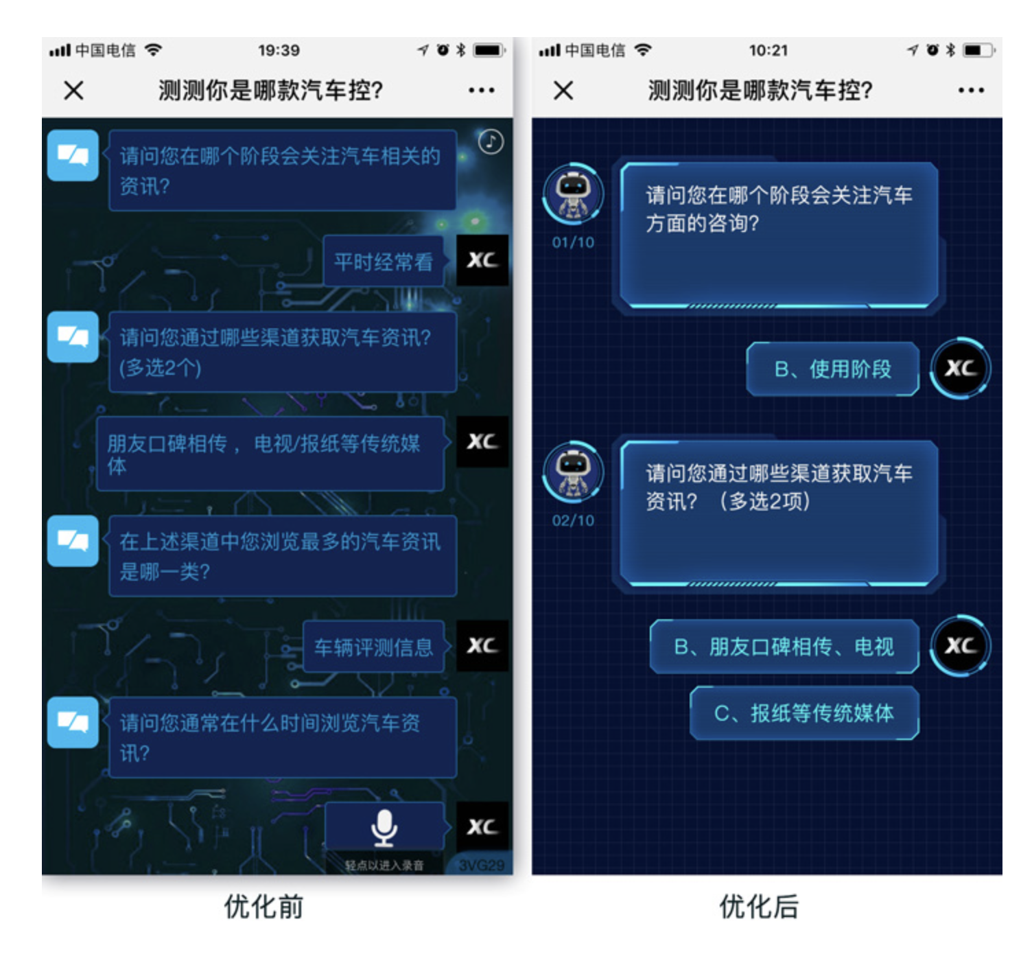 基于「形式追隨功能」的核心思路,我們對(duì)該汽車測評(píng) H5 進(jìn)行了全維度優(yōu)化,通過減少視覺入口、動(dòng)畫引導(dǎo)、強(qiáng)化視覺牽引、區(qū)分對(duì)話框四大核心視覺引導(dǎo)技法,解決原有設(shè)計(jì)的痛點(diǎn),同時(shí)兼顧人機(jī)對(duì)話的科技感與智能感,實(shí)現(xiàn)形式與功能的平衡。以下為具體優(yōu)化思路與技法落地: