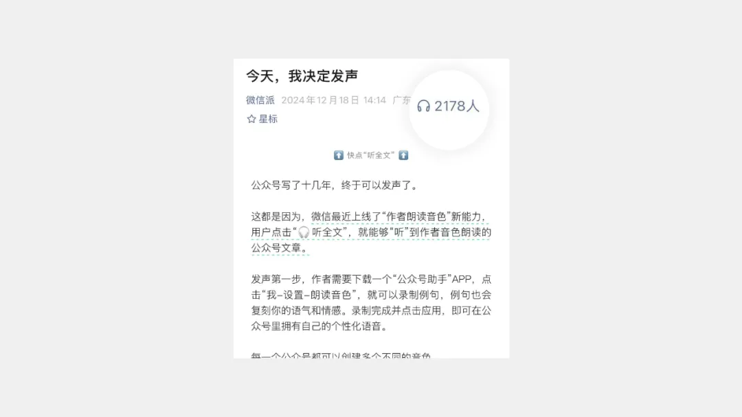“創作者音色復刻”功能的誕生,是為提升公眾號“聽全文”功能的體驗。通過此功能,作者僅需朗讀一段系統提供文本,AI 即可復刻出作者音色。復刻后,讀者就可以在聽全文時能聽到 AI 模仿作者的專屬音色,本文將聚焦的是作者錄入并復刻音色的流程。