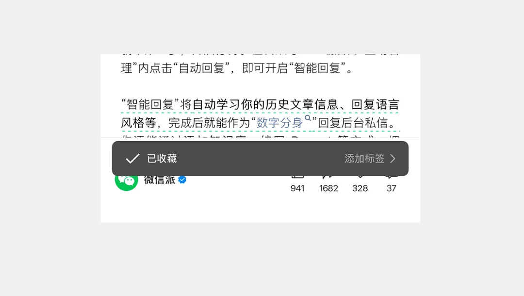 ▲用戶收藏公眾文章后,界面顯示“已收藏”并伴隨成功動效,明確告知操作結果。