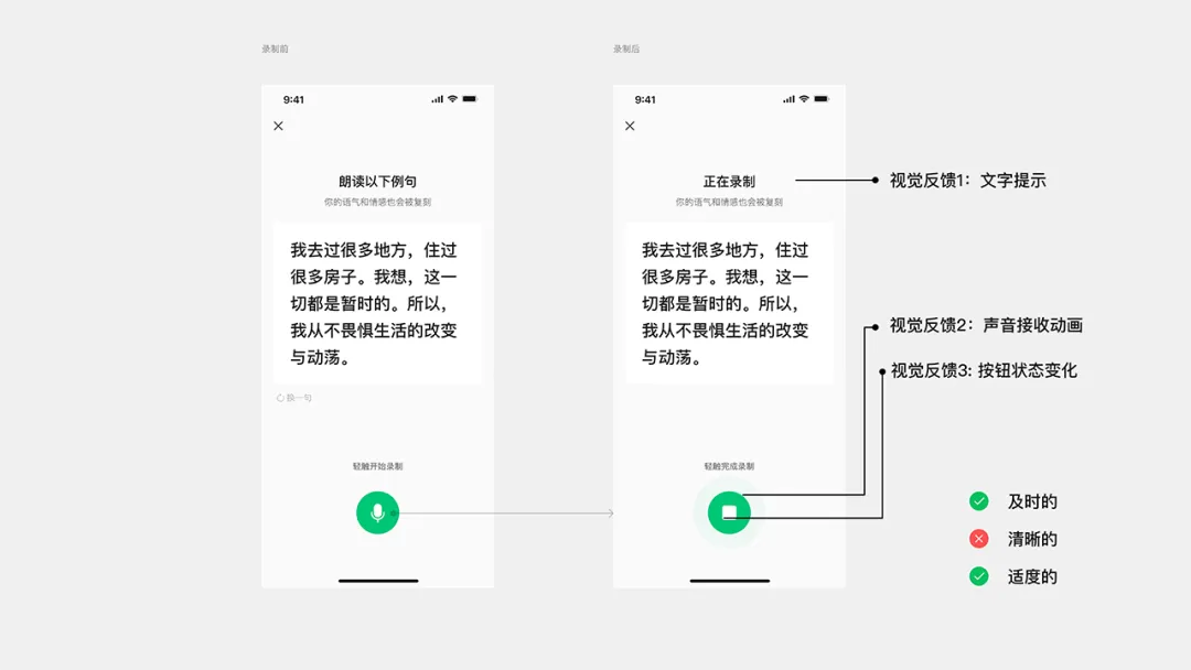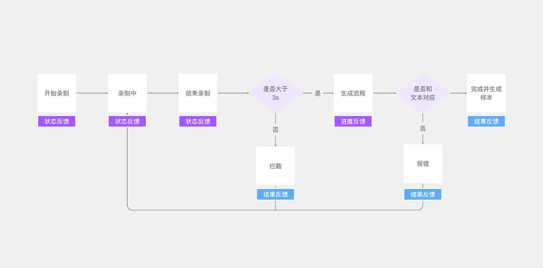 回到“創作者音色復刻”項目中,作者為每個反饋節點匹配了最貼合的類型。例如,“開始錄制”節點采用狀態反饋確保操作確認,“等待錄音處理”節點采用進度反饋管理用戶等待預期,“朗讀完成”節點采用結果反饋明確操作結果。