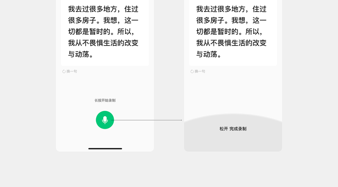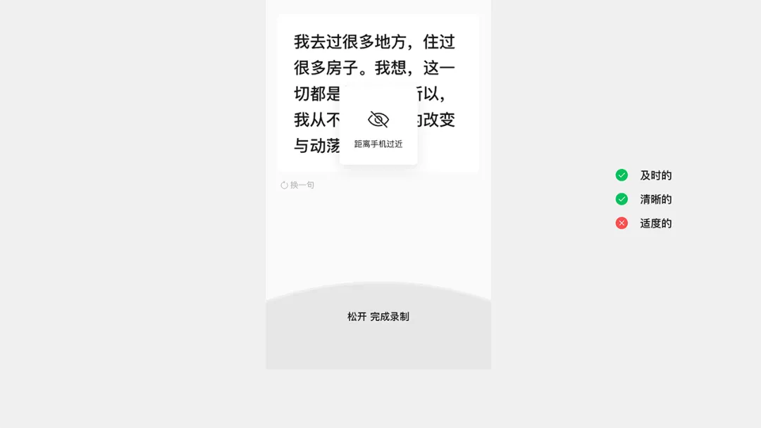 新的方案,顯著改善了用戶的錄音姿勢——輕觸操作自然避免了用戶過度靠近設備的行為,同時保持了舒適的閱讀角度。通過交互的優化,我們從根源上解決了問題產生的前提條件。