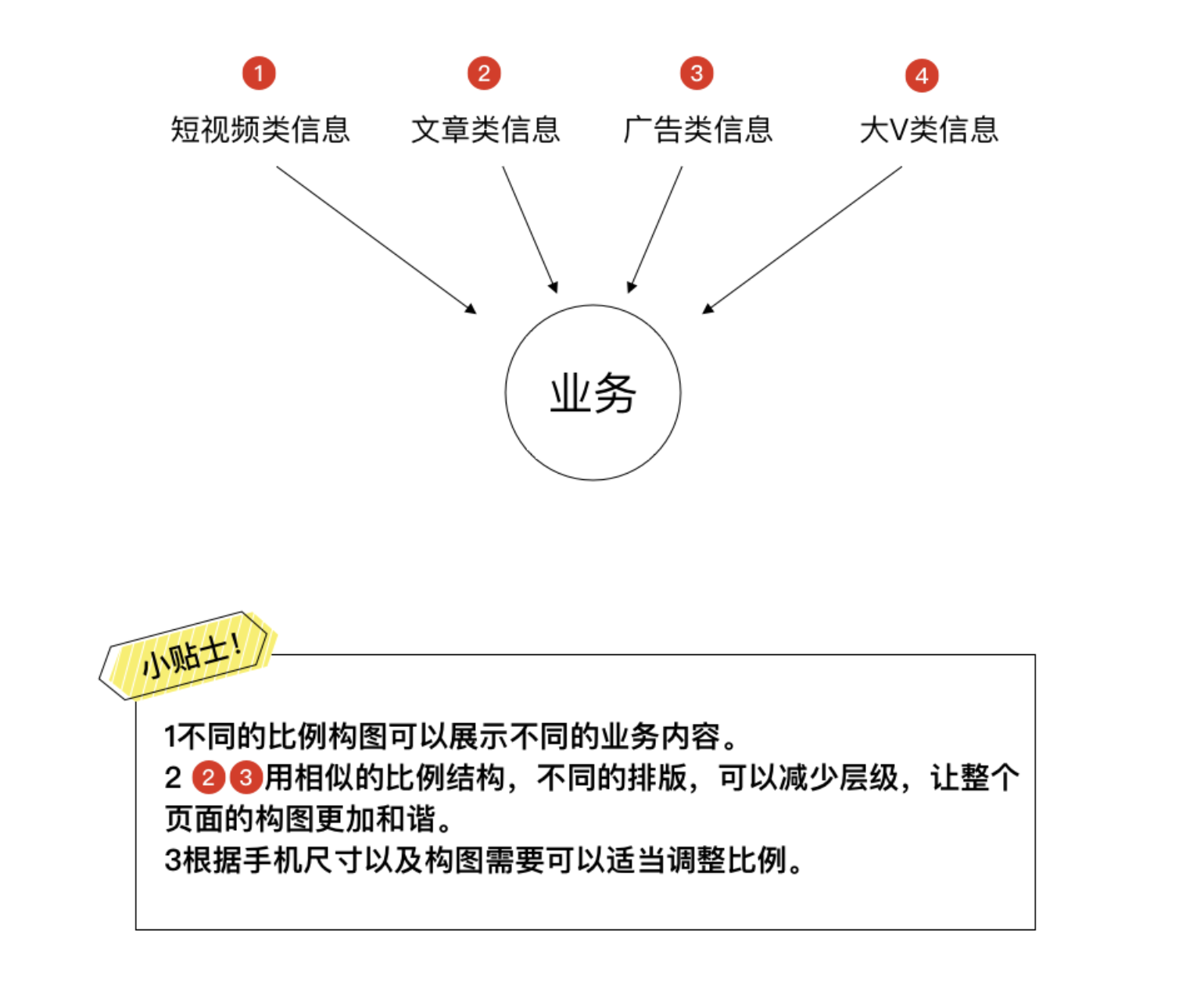 按業(yè)務維度適配比例,一屏頁面中可根據(jù)不同業(yè)務線的信息屬性,搭配多種近似黃金分割比,比如短視頻類信息用 1:1、文章類信息用 2:3、廣告類信息用 5:8,用差異化比例區(qū)分信息層級,讓構(gòu)圖和諧且有層次;二是