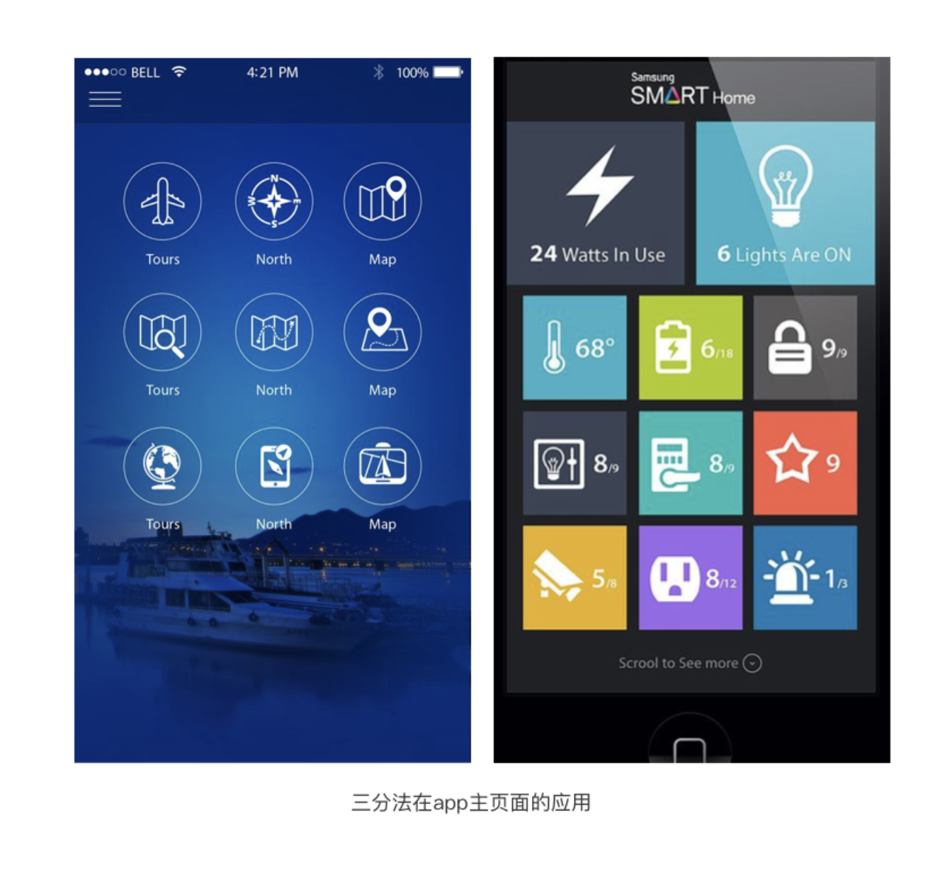 三分法構(gòu)圖指將界面的長與寬各橫向、縱向三等分,形成九宮格式的分割線,分割線的交點或每一分的中心位置,都是視覺焦點區(qū)域,適合放置界面的核心主體元素。幾乎所有 APP 的功能主體設計,都能找到三分法構(gòu)圖的影子,其核心是利用視覺偏好,讓用戶快速捕捉核心信息。
