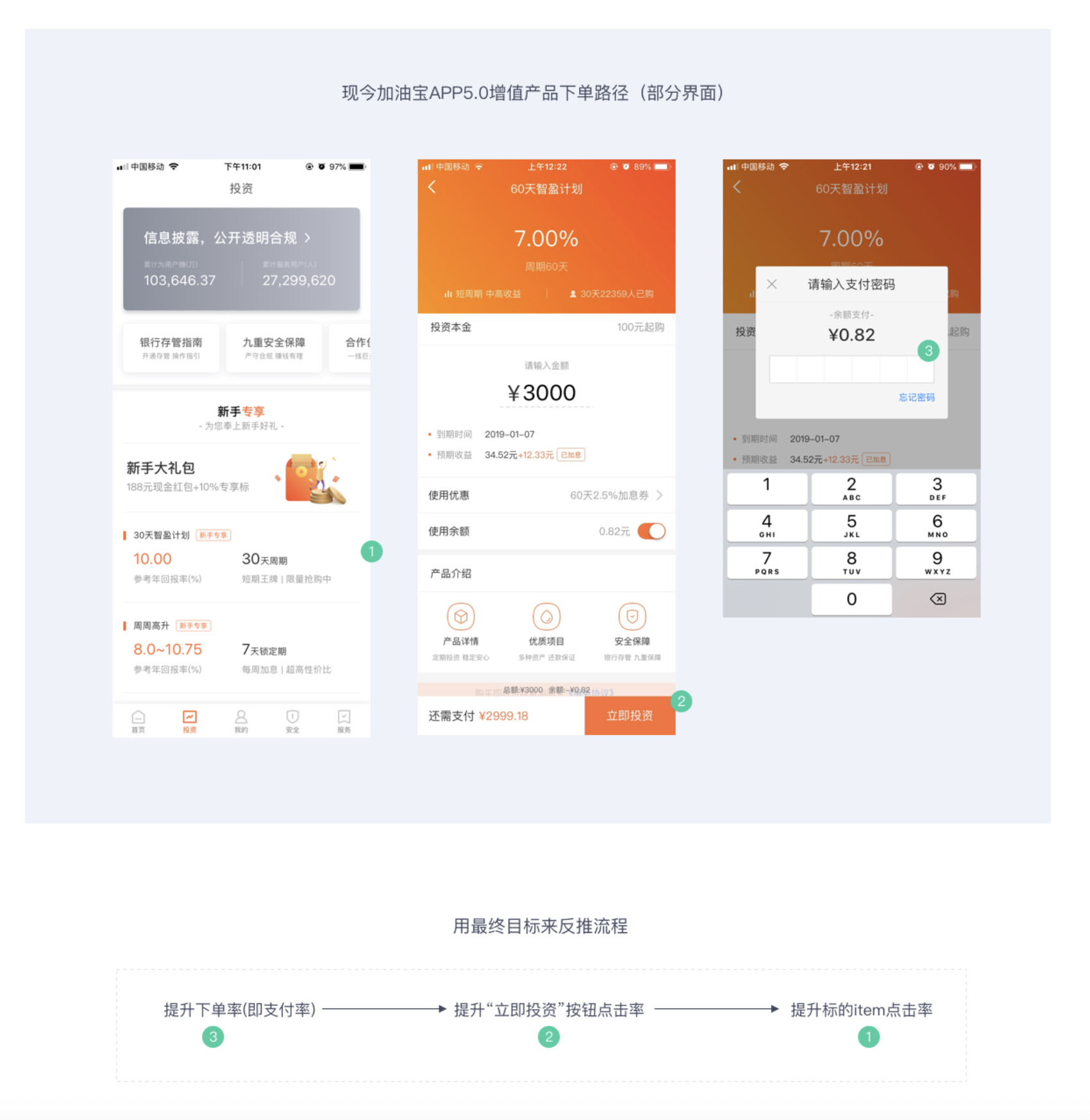 比如核心目標是 “提升理財產品下單率”,蘭亭妙微會將其拆解為三個關鍵小目標,并反推出各環節的設計要點:
