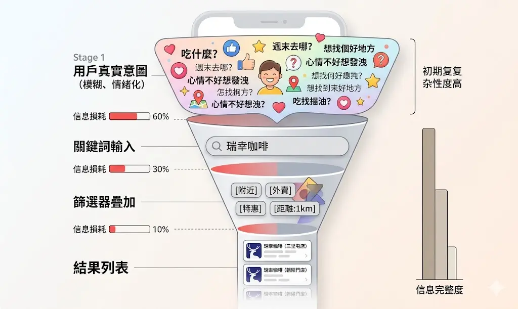 問題在于,這個翻譯過程存在天然的信息損耗。人類表達需求的方式是自然語言,是帶有情緒和上下文的整句話;但關鍵詞搜索要求的是最小化、去語境化的詞組。當你把“想找一家適合帶父母的安靜粵菜館”壓縮為“粵菜 安靜”,你已經丟失了“帶父母”所暗含的價值感需求——面子、正式感、停車便利、服務周到。這些維度,任何篩選器都覆蓋不到。